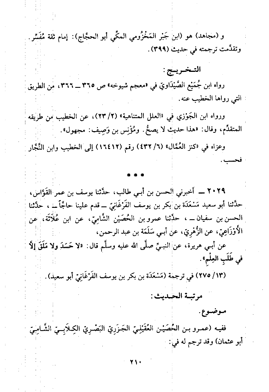 ٢٠٢٩ - أخبرني الحسن بن أبي طالب، حدَّثنا يوسف بن عمر القَوَّاس، حدَّثنا أبو سعيد مَسْعَدَة بن بكر بن يوسف الفَرْغَانِيّ -قدم علينا حاجًّا-، حدَّثنا الحسن بن سفيان، حدَّثنا عمرو بن الحُصَيْن الشَّامي، عن ابن عُلَاثَة، عن الأَوْزَاعِيّ، عن الزُّهْرِيّ، عن أبي سَلَمَة بن عبد الرحمن،