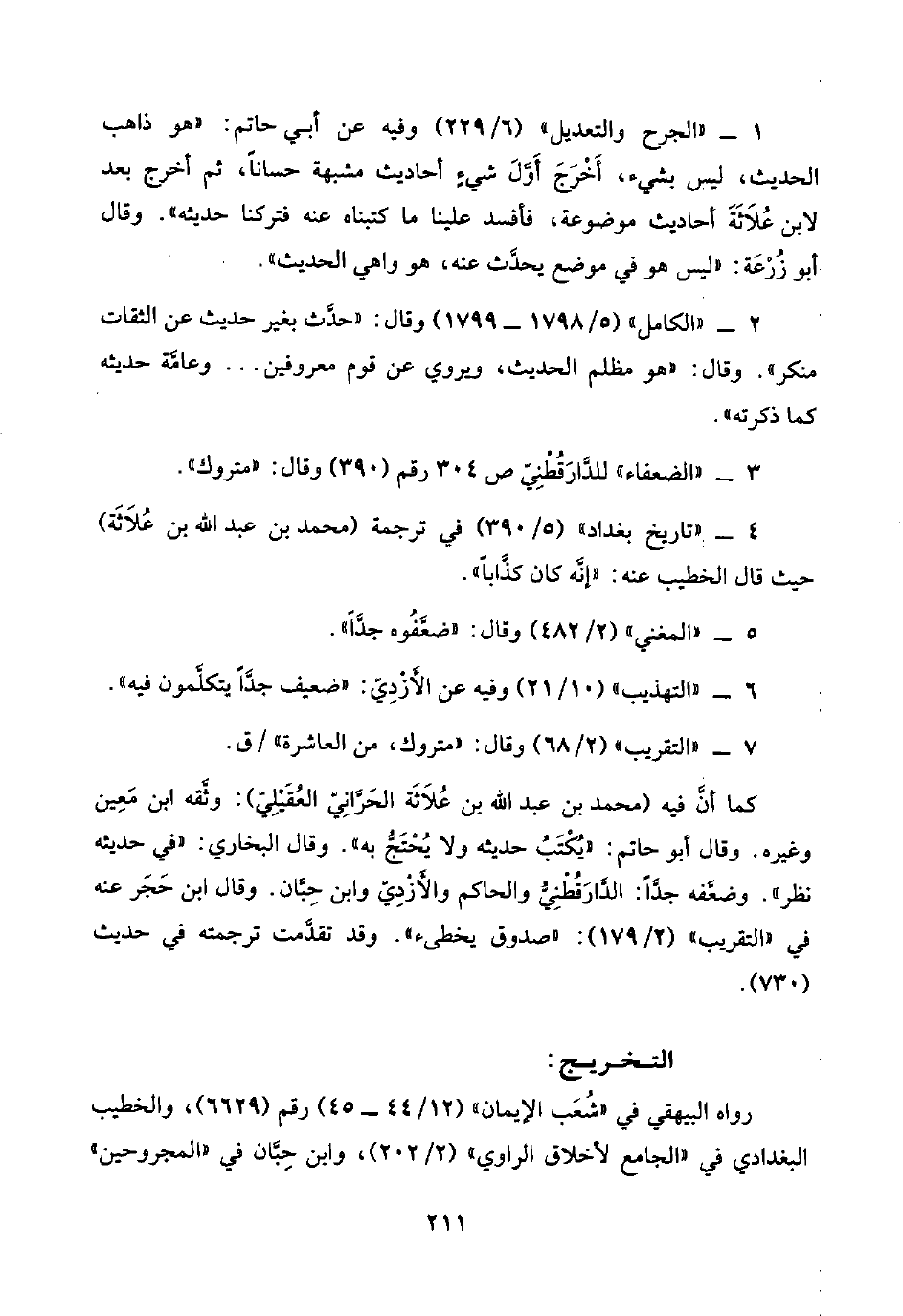 كما أنَّ فيه (محمد بن عبد اللَّه بن عُلَاثَة الحَرَّانِيّ العُقَيْلِي): وثَّقه ابن مَعِين وغيره. وقال أبو حاتم: "يُكْتَبُ حديثه ولا يُحْتَجُّ به". وقال البُخَاري: "في حديثه نظر". وضعَّفه جدًّا: الدَّارَقُطْنِيُّ والحاكم والأَزْدِيّ وابن حِبَّان. وقال ابن حَجَر عنه في "التقريب" (٢/ ١٧٩): "صدوق يخطئ". وقد تقدَّمت ترجمته في حديث (٧٣٠).