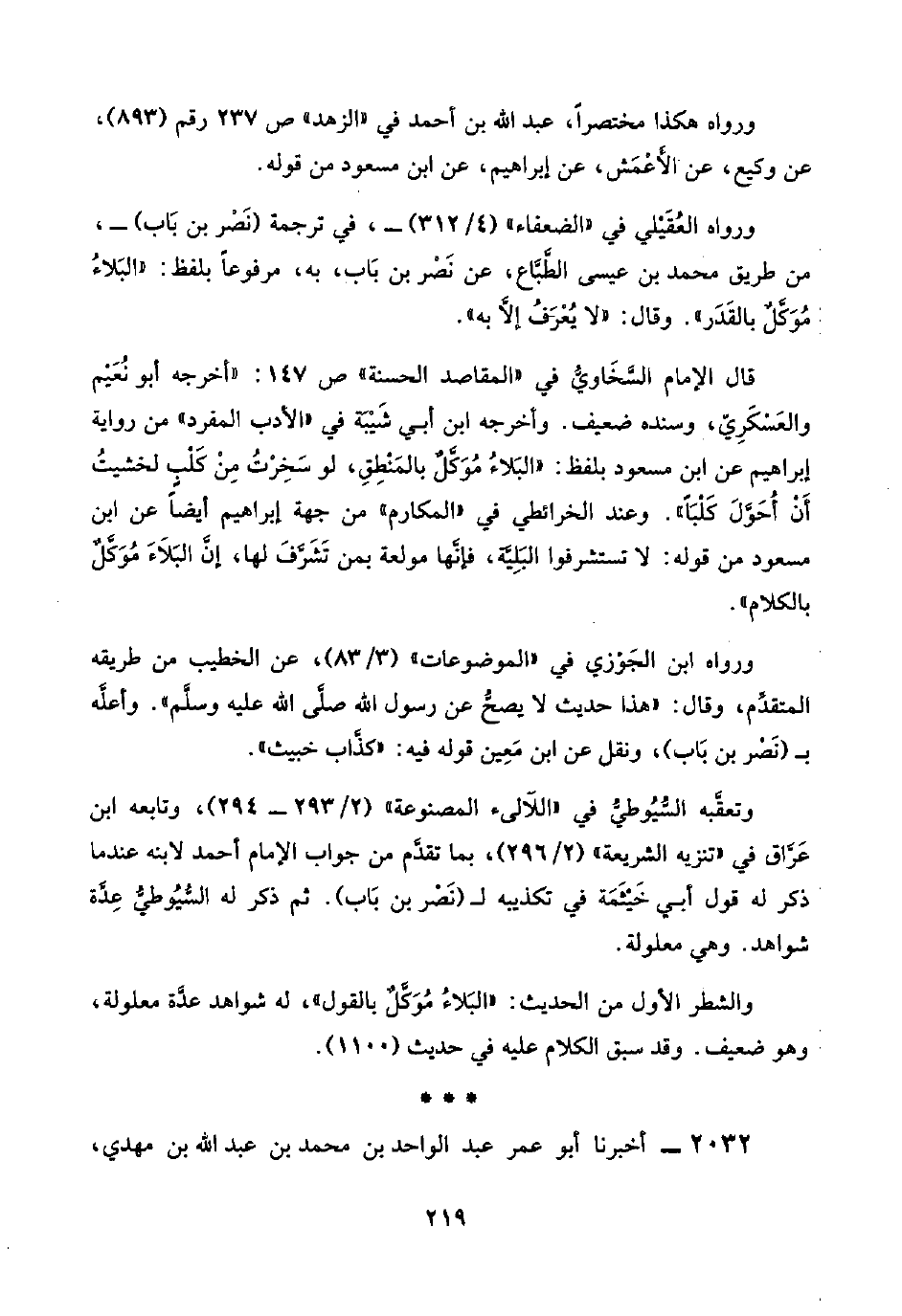 وتعقَّبه السُّيُوطِيُّ في "اللآلئ المصنوعة" (٢/ ٢٩٣ - ٢٩٤)، وتابعه ابن عَرَّاق في "تنزيه الشريعة" (٢/ ٢٩٦)، بما تقدَّم من جواب الإِمام أحمد لابنه عندما ذكر له قول أبي خَيْثَمة في تكذيبه لـ (نَصْر بن باب). ثم ذكر له السُّيُوطِيُّ عِدَّة شواهد. وهي معلولة.