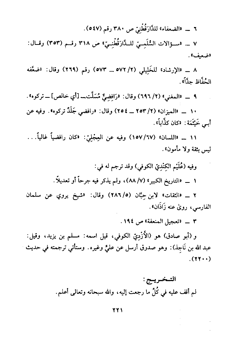 ٩ - "المغني" (٢/ ٦٩٦) وقال: "رَافِضِيٌّ مُسَلَّت -[أي خالص]- تركوه".