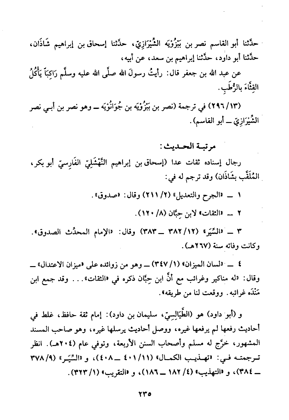 ٣ - "السِّيَر" (١٢/ ٣٨٢ - ٣٨٣) وقال: "الإمام المحدِّث الصدوق". وكانت وفاته سنة (٢٦٧ هـ).