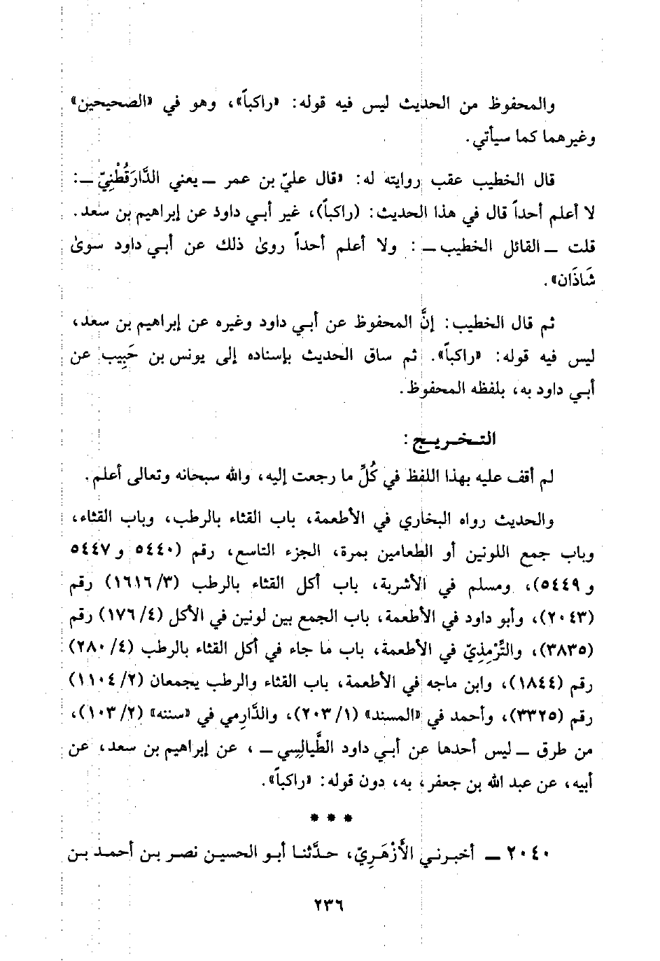 ثم قال الخطيب: "إنَّ المحفوظ عن أبي داود وغيره عن إبراهيم بن سعد، ليس فيه قوله: "راكبًا". ثم ساق الحديث بإسناده إلى يونس بن حَبِيب عن أبي داود به، بلفظه المحفوظ.
