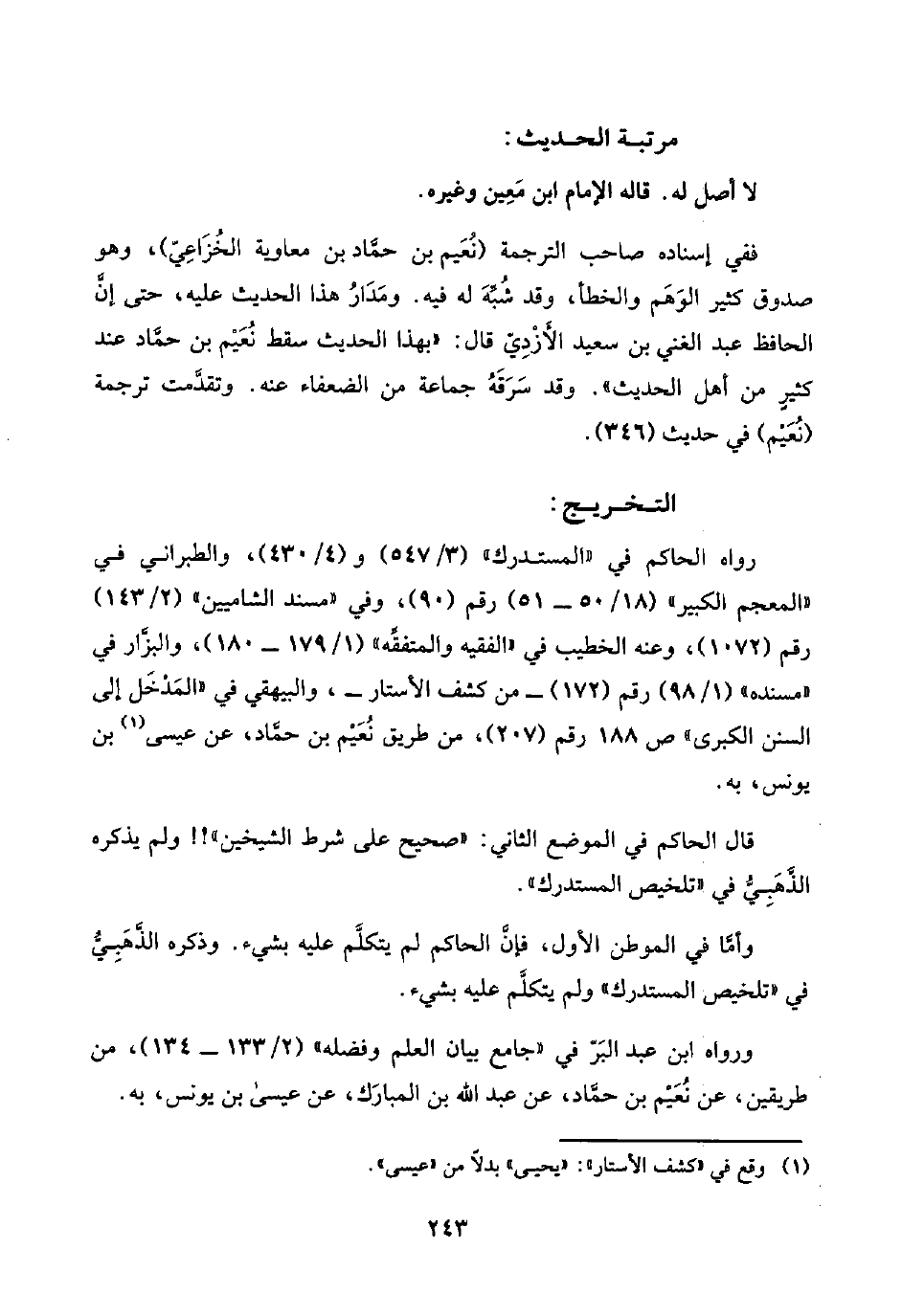ففي إسناده صاحب الترجمة (نُعَيْم بن حمَّاد بن معاوية الخُزَاعِيّ)، وهو صدوق كثير الوَهَم والخطأ، وقد شُبِّهَ له فيه. ومَدَارُ هذا الحديث عليه، حتَّى إنَّ الحافظ عبد الغني بن سعيد الأَزْدِيّ قال: "بهذا الحديث سقط نُعَيْم بن حمَّاد عند كثيرٍ من أهل الحديث". وقد سَرَقَهُ جماعة من الضعفاء عنه. وتقدَّمت ترجمة (نُعَيْم) في حديث (٣٤٦).