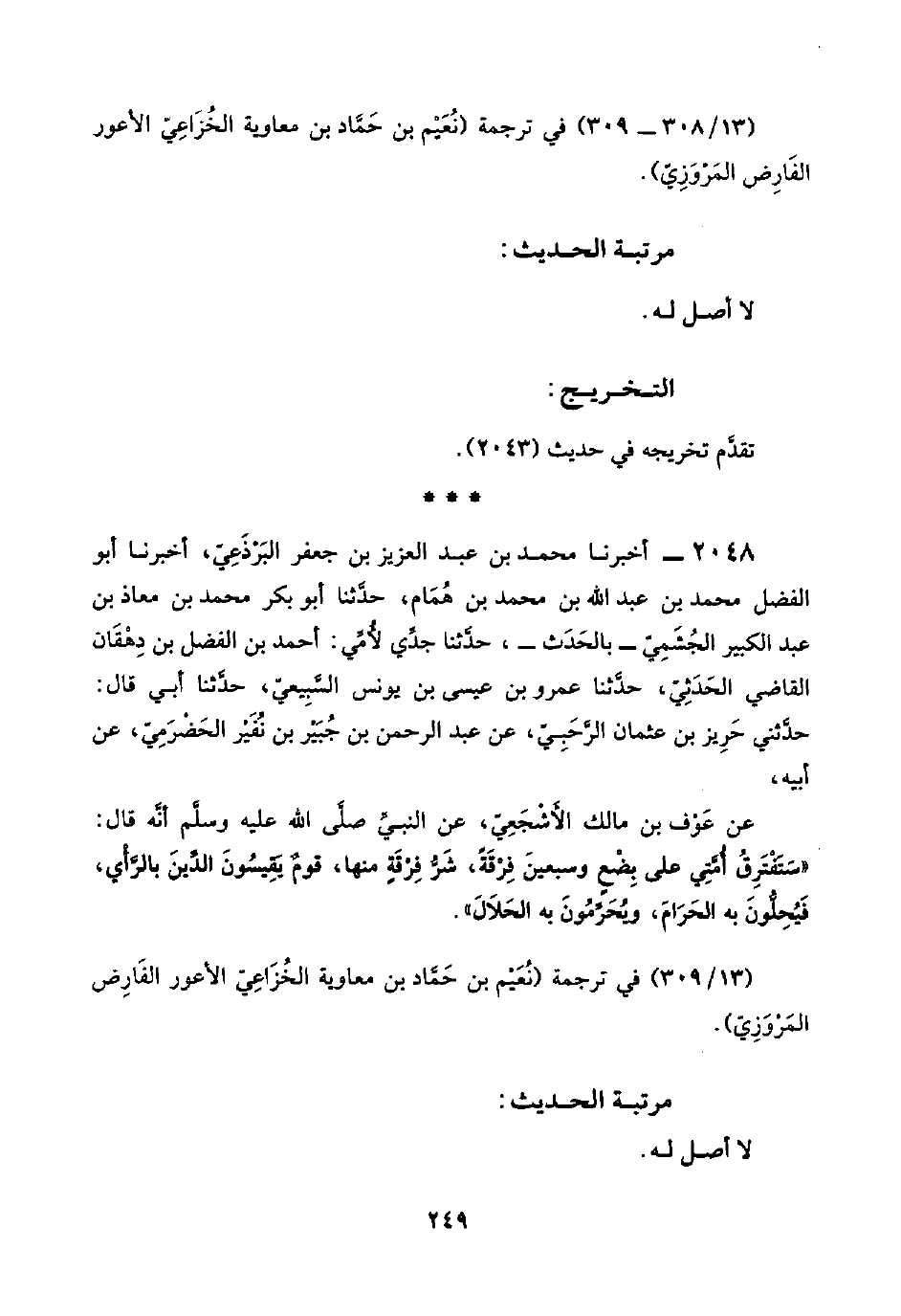 (١٣/ ٣٠٨ - ٣٠٩) في ترجمة (نُعَيْم بن حَمَّاد بن معاوية الخُزَاعِيّ الأعور الفَارِض المَرْوَزِيّ).