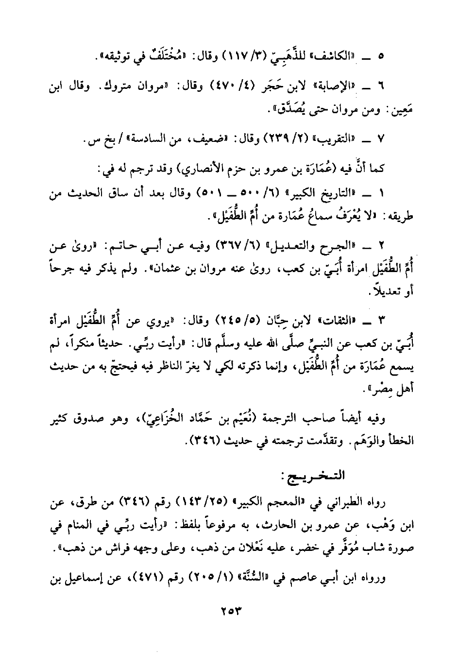 ٣ - "الثقات" لابن حِبَّان (٥/ ٢٤٥) وقال: "يروي عن أُمِّ الطُّفَيْل امرأة أُبَيّ بن كعب عن النبيِّ صلَّى اللَّه عليه وسلَّم قال: "رأيت ربِّي. حديثًا منكرًا، لم يسمع عُمَارَة من أُمِّ الطُّفَيْل، وإنما ذكرته لكي لا يغرّ الناظر فيه فيحتجّ به من حديث أهل مِصْر".