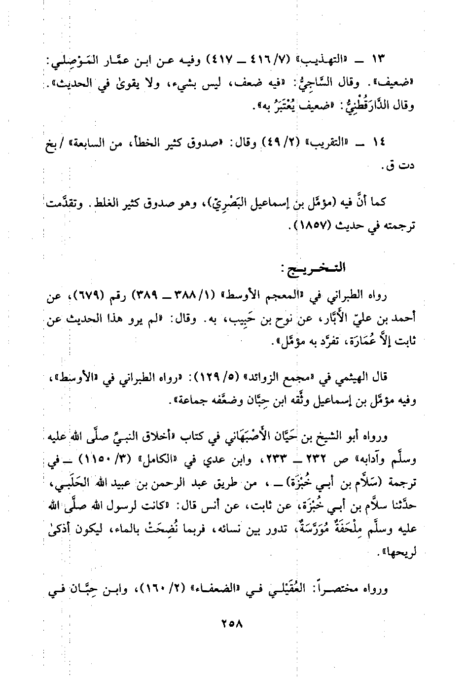١٣ - "التهذيب" (٧/ ٤١٦ - ٤١٧) وفيه عن ابن عمَّار المَوْصلِي: "ضعيف". وقال السَّاجِيُّ: "فيه ضعف، ليس بشيء، ولا يقوى في الحديث". وقال الدَّارَقُطْنِيُّ: "ضعيف يُعْتَب به".