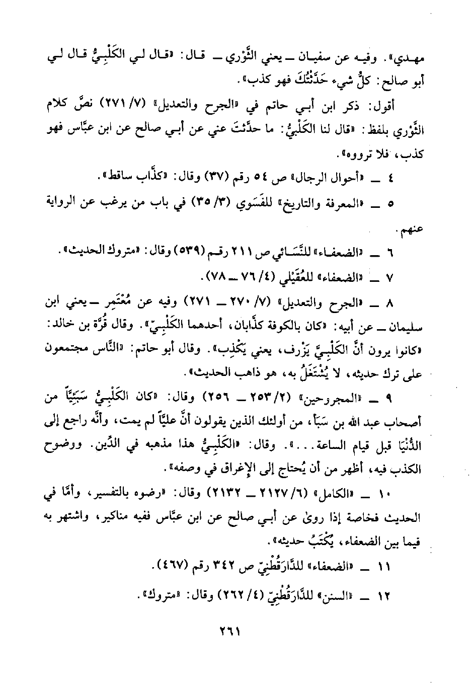 ٩ - "المجروحين" (٢/ ٢٥٣ - ٢٥٦) وقال: "كان الكَلْبِيُّ سَبَئِيًّا من أصحاب عبد اللَّه بن سَبَأ، من أولئك الذين يقولون أنَّ عليًّا لم يمت، وأنَّه راجع إلى الدُّنْيَا قبل قيام الساعة. . . ". وقال: "الكَلْبِيُّ هذا مذهبه في الدِّين. ووضوح الكذب فيه، أظهر من أن يُحتاج إلى الإغراق في وصفه".