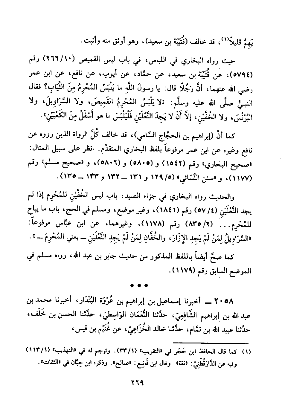 حيث رواه البُخَاري في اللباس، في باب لبس القميص (١٠/ ٢٦٦) رقم (٥٧٩٤)، عن قُتَيْبَة بن سعيد، عن حمَّاد، عن أيوب، عن نافع، عن ابن عمر رضي اللَّه عنهما، أنَّ رَجُلًا قال: يا رسولَ اللَّهِ ما يَلْبَسُ المُحْرِمُ مِنَ الثِّيَابِ؟ فقال النبيّ صلَّى اللَّه عليه وسلَّم: "لا يَلْبَسُ المُحْرِمُ القَميِصَ، ولا السَّرَاوِيلَ، ولا البُرْنُسَ، ولا الخُفَّيْن، إلَّا أَنْ لا يَجِدَ النَّعْلَيْنِ فَلْيَلْبَسْ ما هو أَسْفَلُ مِنَ الكَعْبَيْنِ".