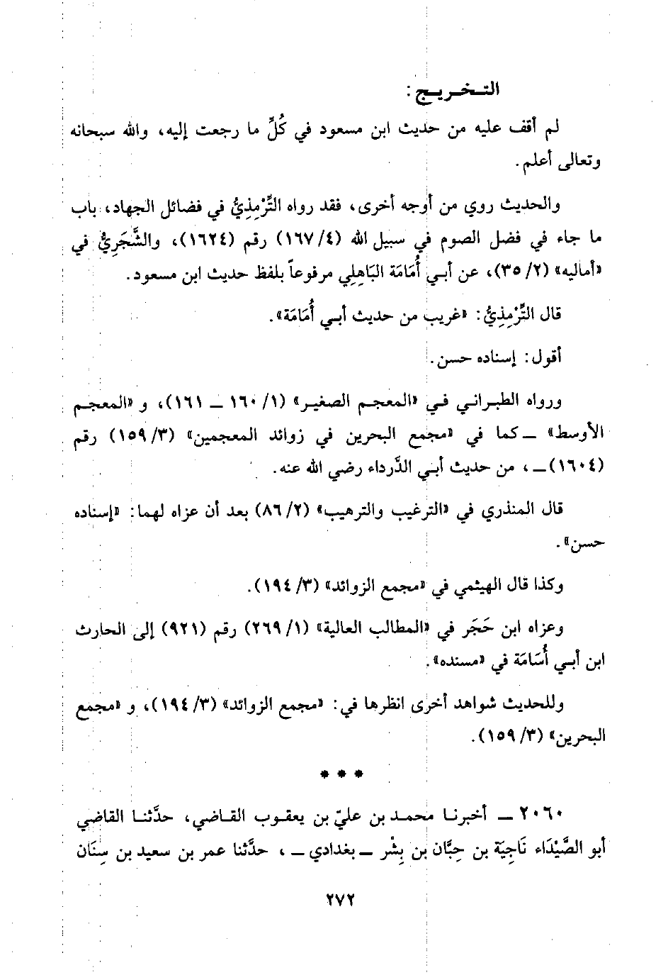 ٢٠٦٠ - أخبرنا محمد بن عليّ بن يعقوب القاضي، حدَّثنا القاضي أبو الصَّيْدَاء نَاجِيَة بن حِبَّان بن بِشْر -بغدادي-، حدَّثنا عمر بن سعيد بن سِنَان