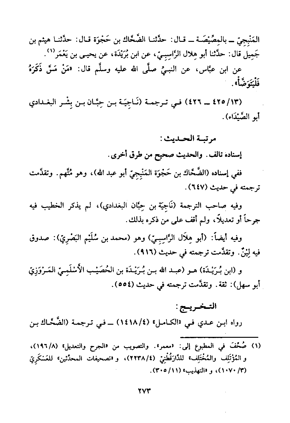 المَنْبِجِيّ -بالمِصِّيْصَة- قال: حدَّثنا الضَّحَّاك بن حَجْوَة قال: حدَّثنا هيثم بن جَمِيل قال: حدَّثنا أبو هِلال الرَّاسِبِيّ، عن ابن بُرَيْدَة، عن يحيى بن يَعْمَر (¬١).