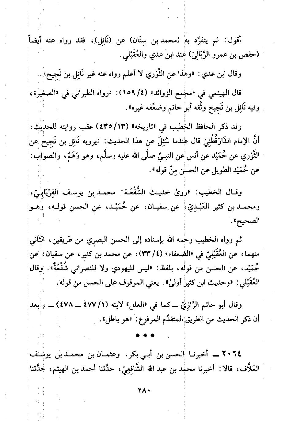 وقد ذكر الحافظ الخطيب في "تاريخه" (١٣/ ٤٣٥) عقب روايته للحديث، أنَّ الإِمام الدَّارَقُطْنِيّ قال عندما سُئِل عن هذا الحديث: "يرويه نَائِل بن نَجِيح عن الثَّوْري عن حُمَيْد عن أنس عن النبيِّ صلَّى اللَّه عليه وسلَّم، وهو وَهَمٌ، والصَّواب: عن حُمَيْد الطويل عن الحسن مِنْ قوله".