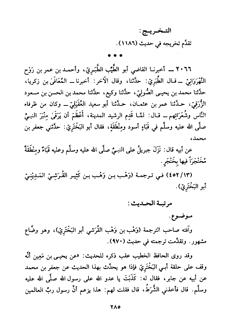 ٢٠٦٦ - أخبرنا القاضي أبو الطَّيِّب الطَّبَرِيّ، وأحمد بن عمر بن رَوْح النَّهْرَوانِيّ -قال الطَّبَرِيّ: حدَّثنا، وقال الآخر: أخبرنا- المُعَافَى بن زكريا، حدَّثنا محمد بن يحيى الصُّولِيّ، حدَّثنا وكيع، حدَّثنا محمد بن الحسن بن مسعود الزُّرَقِيّ، حدَّثنا عمر بن عثمان، حدَّثنا أبو سعيد العُقَيْلِيّ -وكان من ظرفاء النَّاس وشُعَرَائِهم- قال: لمَّا قَدِم الرشيد المدينة، أَعْظَمَ أن يَرْقَي مِنْبِرَ النبيِّ صلَّى اللَّه عليه وسلَّم في قَبَاءٍ أسود ومِنْطَقَةٍ، فقال أبو البُخْتَرِي: حدَّثني جعفر بن محمد،