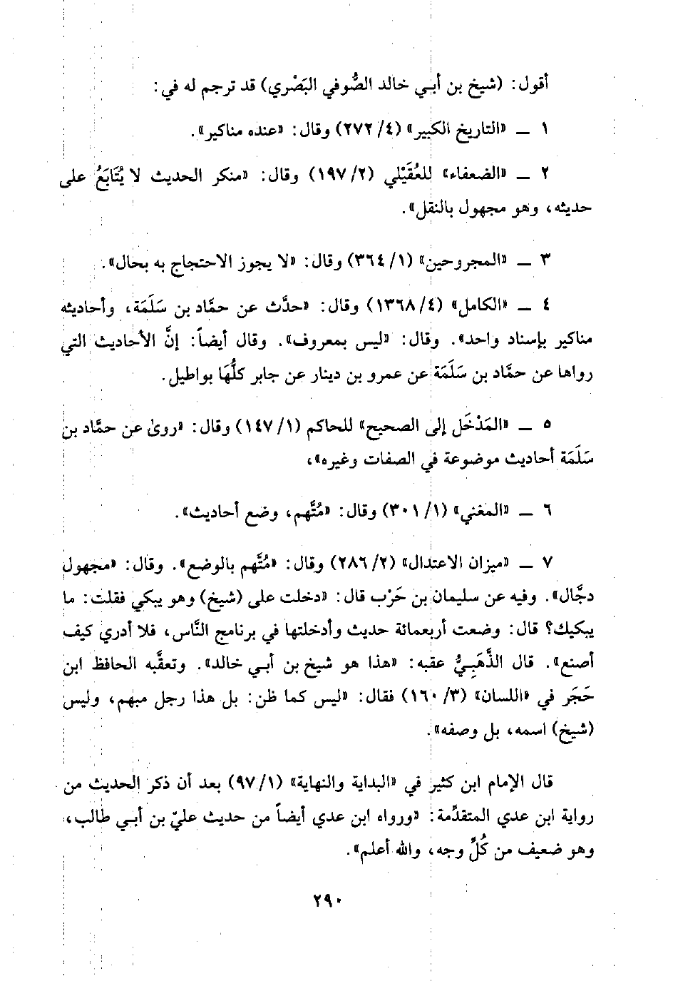 ٧ - "ميزان الاعتدال" (٢/ ٢٨٦) وقال: "مُتَّهم بالوضع". وقال: "مجهول دجَّال". وفيه عن سليمان بن حَرْب قال: "دخلت على (شيخ) وهو يبكي فقلت: ما يبكيك؟ قال: وضعت أربعمائة حديث وأدخلتها في برنامج النَّاس، فلا أدري كيف أصنع". قال الذَّهَبِيُّ عقبه: "هذا هو شيخ بن أبي خالد". وتعقَّبه الحافظ ابن حَجَر في "اللسان" (٣/ ١٦٠) فقال: "ليس كما ظن: بل هذا رجل مبهم، وليس (شيخ) اسمه، بل وصفه".