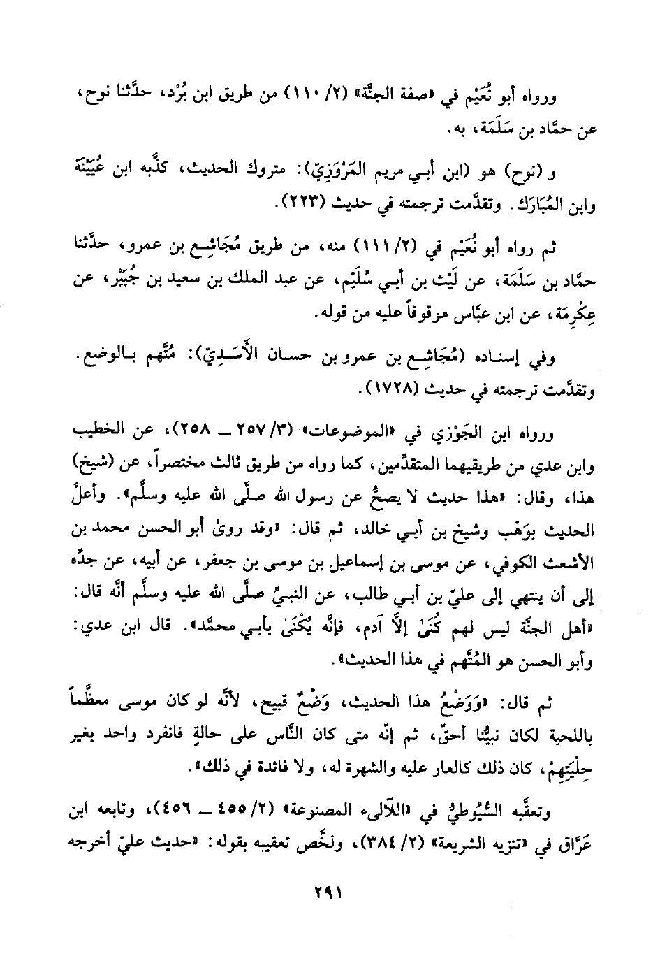 وتعقَّبه السُّيُوطيُّ في "اللآلئ المصنوعة" (٢/ ٤٥٥ - ٤٥٦)، وتابعه ابن عَرَّاق في "تنزيه الشريعة" (٢/ ٣٨٤)، ولخَّص تعقيبه بقوله: "حديث عليّ أخرجه