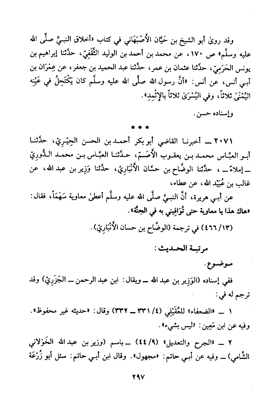 ٢٠٧١ - أخبرنا القاضي أبو بكر أحمد بن الحسن الحِيْرِيّ، حدَّثنا أبو العبَّاس محمد بن يعقوب الأَصَمّ، حدَّثنا العبَّاس بن محمد الدُّورِيّ -إملاءً-، حدَّثنا الوضَّاح بن حسَّان الأَنْبَارِيّ، حدَّثنا وَزِير بن عبد اللَّه، عن غالب بن عُبَيْد اللَّه، عن عطاء،