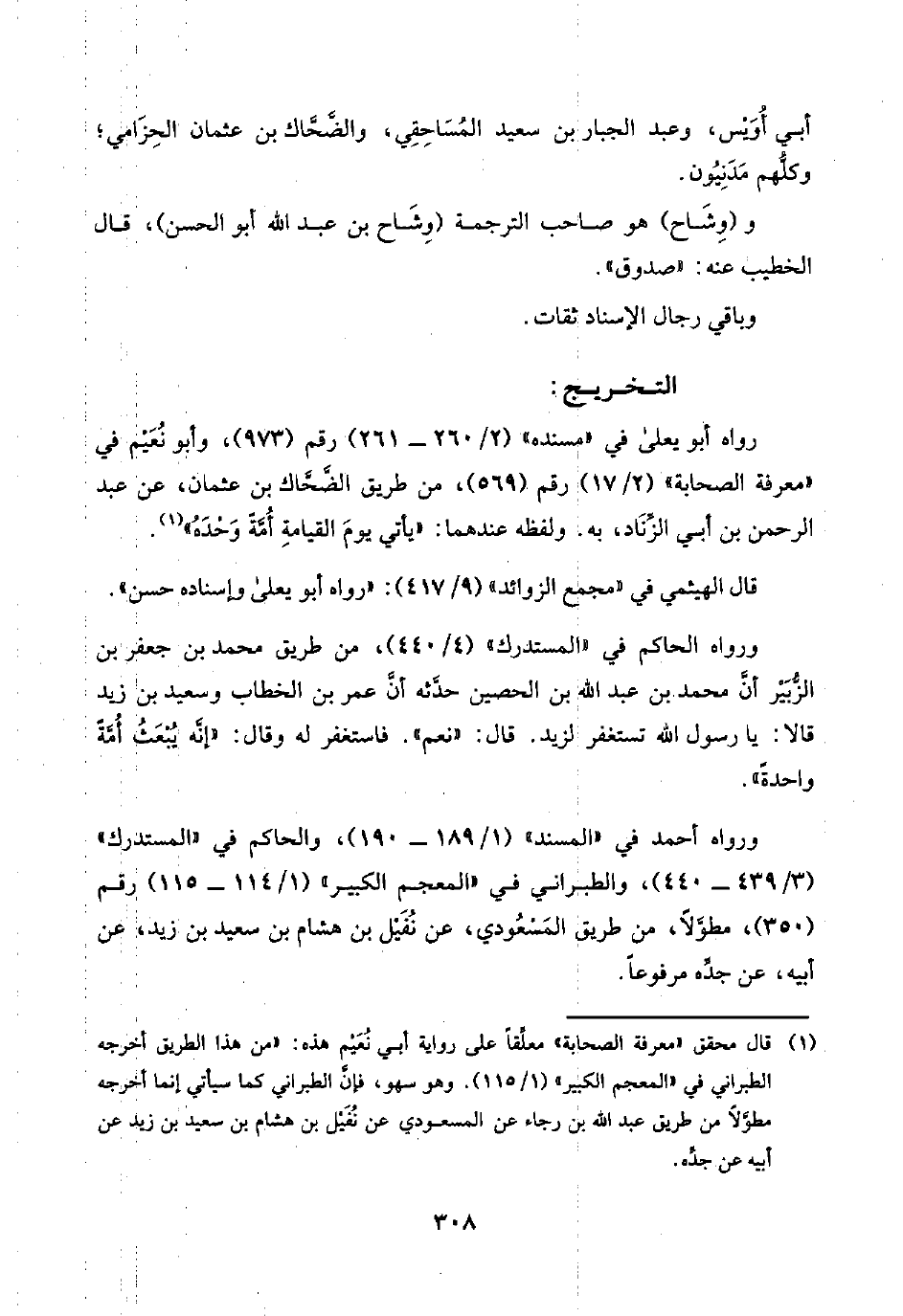 رواه أبو يعلى في "مسنده" (٢/ ٢٦٠ - ٢٦١) رقم (٩٧٣)، وأبو نُعَيْم في "معرفة الصحابة" (٢/ ١٧) رقم (٥٦٩)، من طريق الضَّحَّاك بن عثمان، عن عبد الرحمن بن أبي الزِّنَاد، به، ولفظه عندهما: "يأتي يومَ القيامةِ أُمَّةً وَحْدَهُ" (¬١).