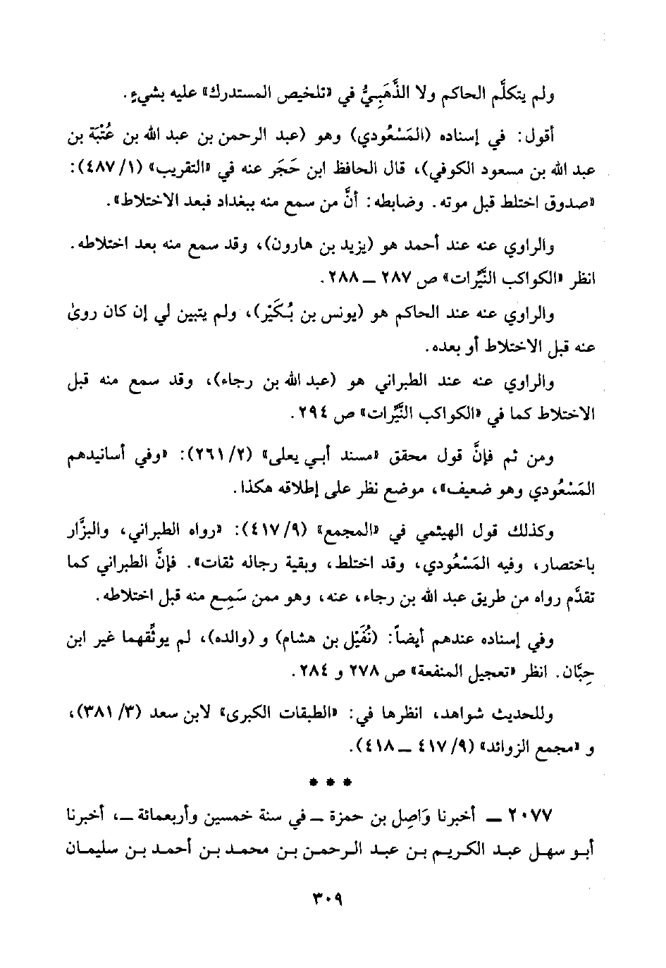 وكذلك قول الهيثمي في "المجمع" (٩/ ٤١٧): "رواه الطبراني، والبزَّار باختصار، وفيه المَسْعُودي، وقد اختلط، وبقية رجاله ثقات". فإنَّ الطبراني كما تقدَّم رواه من طريق عبد اللَّه بن رجاء، عنه، وهو ممن سَمِع منه قبل اختلاطه.