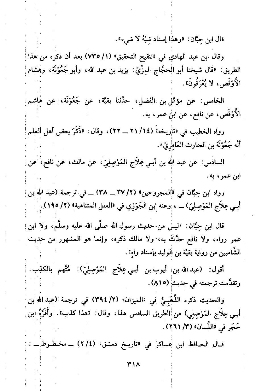 قال ابن حِبَّان: "ليس من حديث رسول اللَّه صلَّى اللَّه عليه وسلَّم، ولا ابن عمر رواه، ولا نافع حدَّثَ به، ولا مالك ذكره، وإنما هو المشهور من حديث الشَّاميين من رواية بقيَّة بن الوليد بإسناد واهٍ".