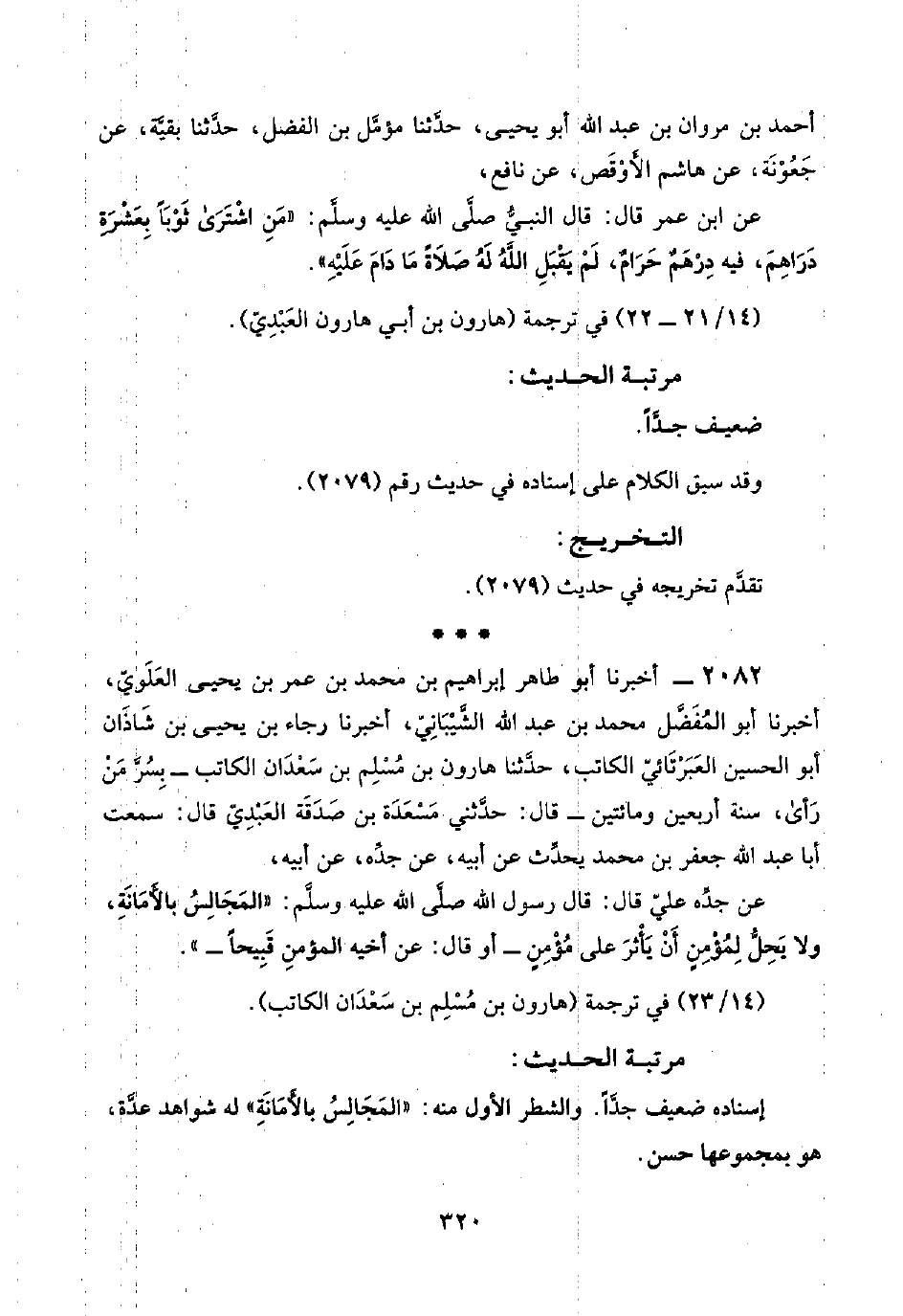٢٠٨٢ - أخبرنا أبو طاهر إبراهيم بن محمد بن عمر بن يحيى العَلَويّ، أخبرنا أبو المُفَضَّل محمد بن عبد اللَّه الشَّيْبَانِيّ، أخبرنا رجاء بن يحيى بن شَاذَان أبو الحسين العَبَرْتَائيّ الكاتب، حدَّثنا هارون بن مُسْلِم بن سَعْدَانَ الكاتب -بِسُرَّ مَنْ رَأى، سنة أربعين ومائتين- قال: حدَّثني مَسْعَدَة بن صَدَقَة العَبْدِيّ قال: سمعت أبا عبد اللَّه جعفر بن محمد يحدِّث عن أبيه، عن جدِّه، عن أبيه،