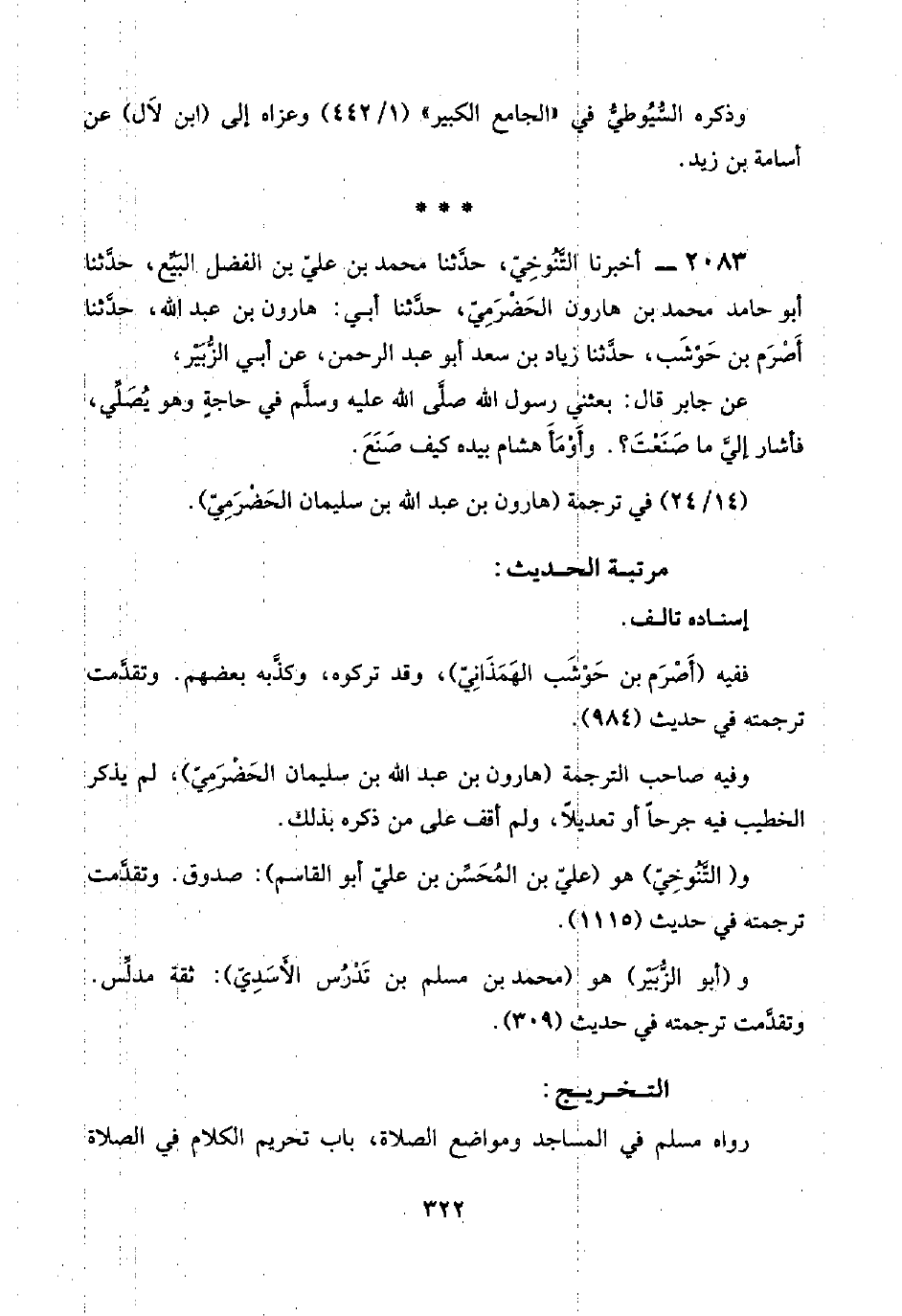 ٢٠٨٣ - أخبرنا التَّنُوخِيّ، حدَّثنا محمد بن علي بن الفضل البَيِّع، حدَّثنا أبو حامد محمد بن هارون الحَضْرَمِيّ، حدَّثنا أبي: هارون بن عبد اللَّه، حدَّثنا أَصْرَم بن حَوْشَب، حدَّثنا زياد بن سعد أبو عبد الرحمن، عن أبي الزُّبَيْر،