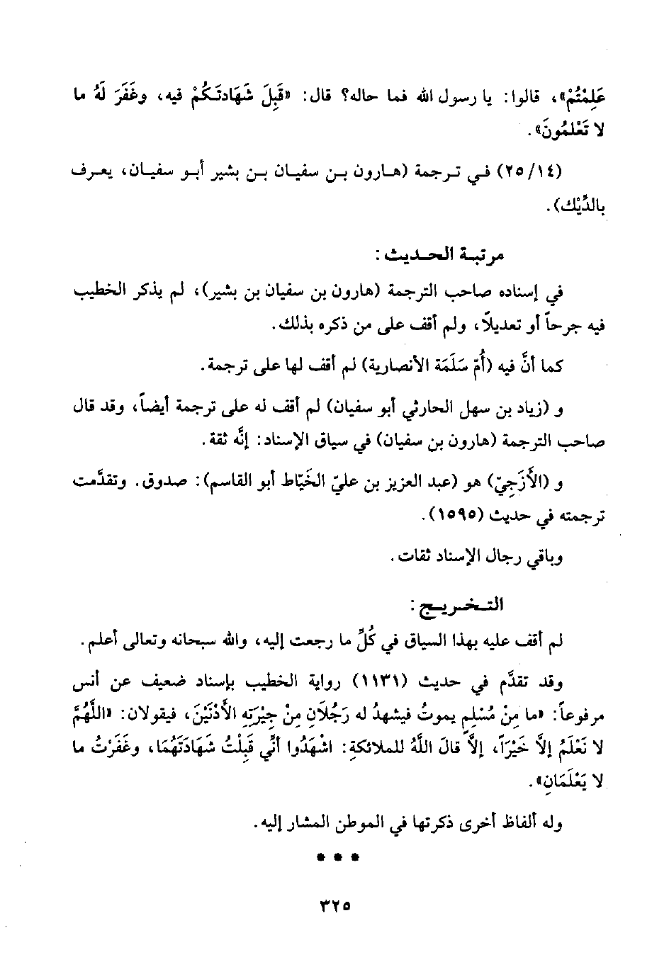 في إسناده صاحب الترجمة (هارون بن سفيان بن بشير)، لم يذكر الخطيب فيه جرحًا أو تعديلًا، ولم أقف على من ذكره بذلك.