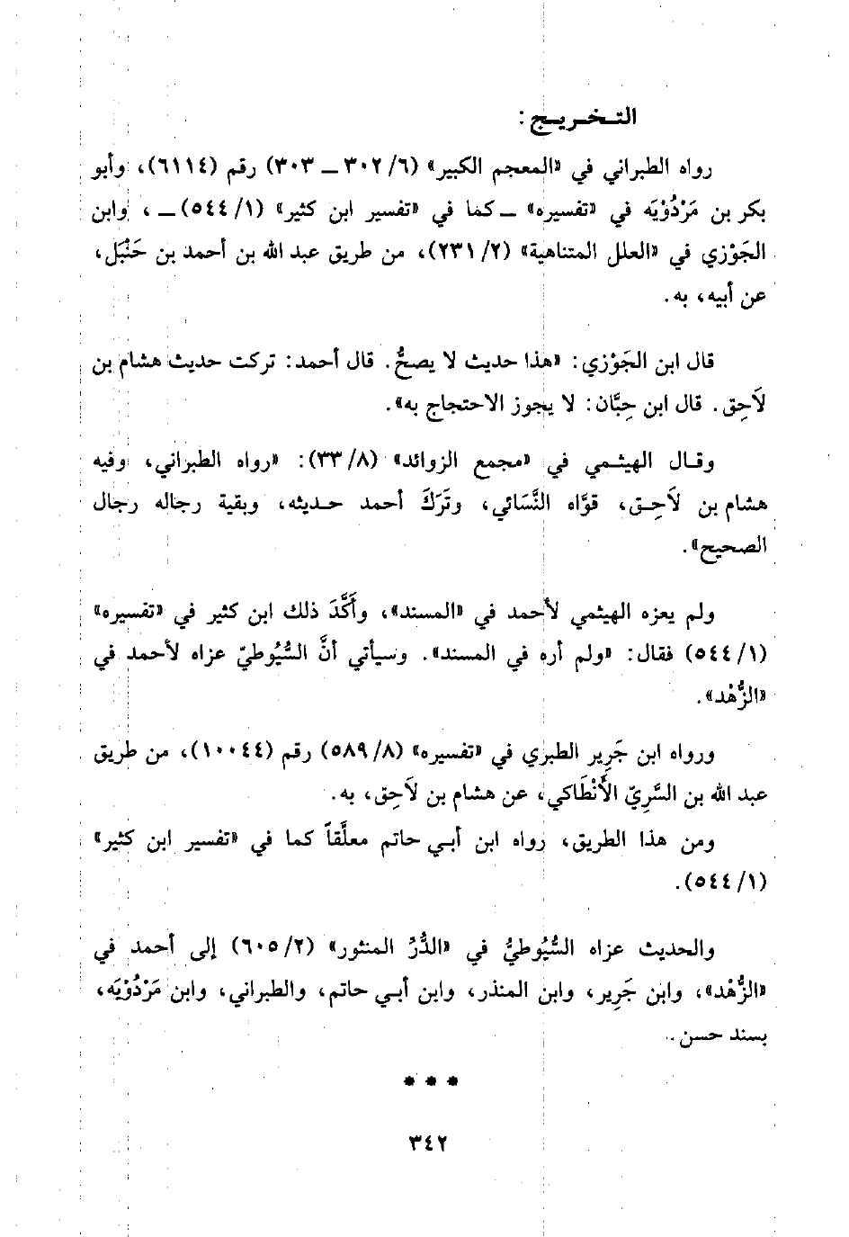 والحديث عزاه السُّيُوطيُّ في "الدُّرِّ المنثور" (٢/ ٦٠٥) إلى أحمد في "الزُّهْد"؛ وابن جَرِير، وابن المنذر، وابن أبي حاتم، والطبراني، وابن مَرْدُوْيَه، بسند حسن.