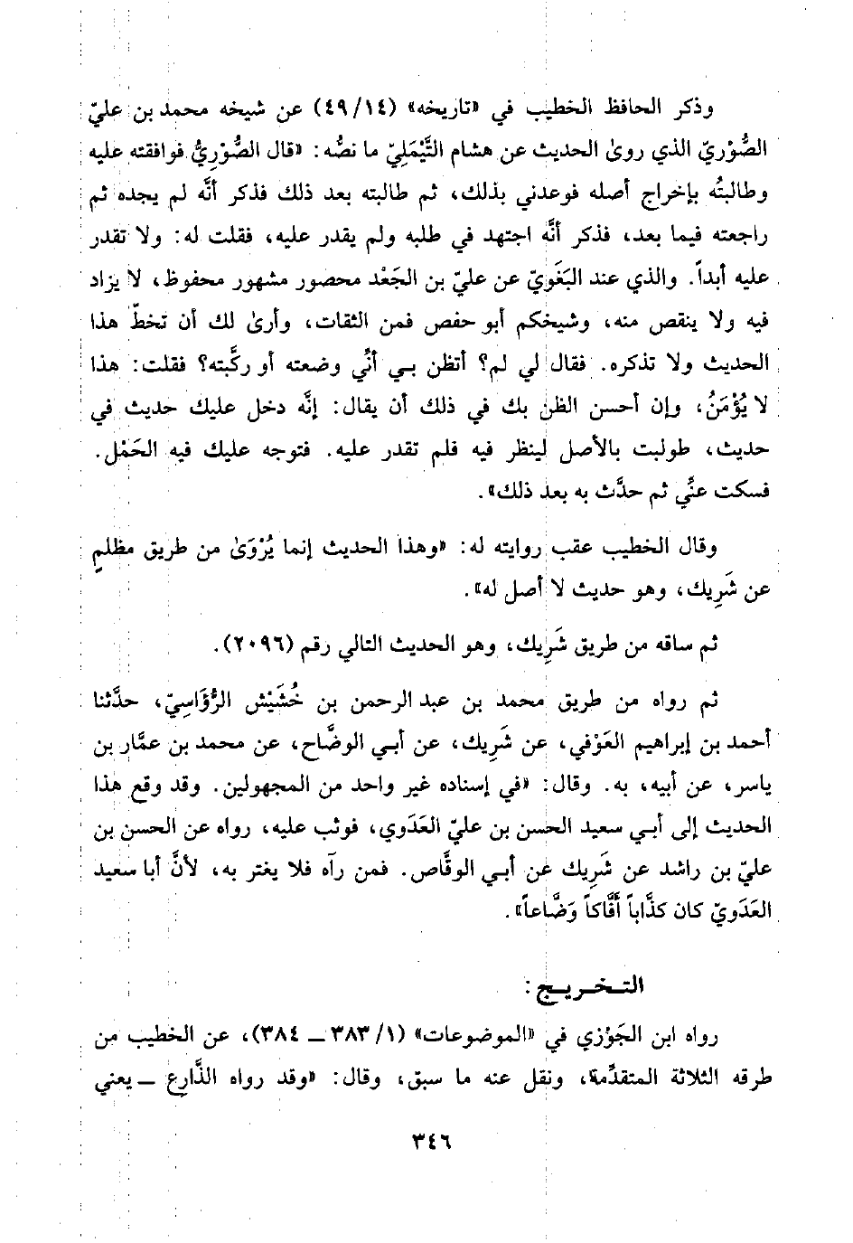 وذكر الحافظ الخطيب في "تاريخه" (١٤/ ٤٩) عن شيخه محمد بن عليّ الصُّوْريّ الذي روى الحديث عن هشام التَّيْمَلِيّ ما نصُّه: "قال الصُّوْرِيُّ فوافقته عليه وطالبتُه بإخراج أصله فوعدني بذلك، ثم طالبته بعد ذلك فذكر أنَّه لم يجده ثم راجعته فيما بعد، فذكر أنَّه اجتهد في طلبه ولم يقدر عليه، فقلت له: ولا تقدر عليه أبدًا. والذي عند البَغَويّ عن عليّ بن الجَعْد محصور مشهور محفوظ، لا يزاد فيه ولا ينقص منه، وشيخكم أبو حفص فمن الثقات، وأرى لك أن تخطّ هذا الحديث ولا تذكره. فقال لي لم؟ أتظن بي أنَّي وضعته أو ركَّبته؟ فقلت: هذا لا يُؤْمَنْ، وإن أحسن الظن بك في ذلك أن يقال: إنَّه دخل عليك حديث في حديث، طولبت بالأصل لينظر فيه فلم تقدر عليه. فتوجه عليك فيه الحَمْل. فسكت عنِّي ثم حدَّث به بعد ذلك".
