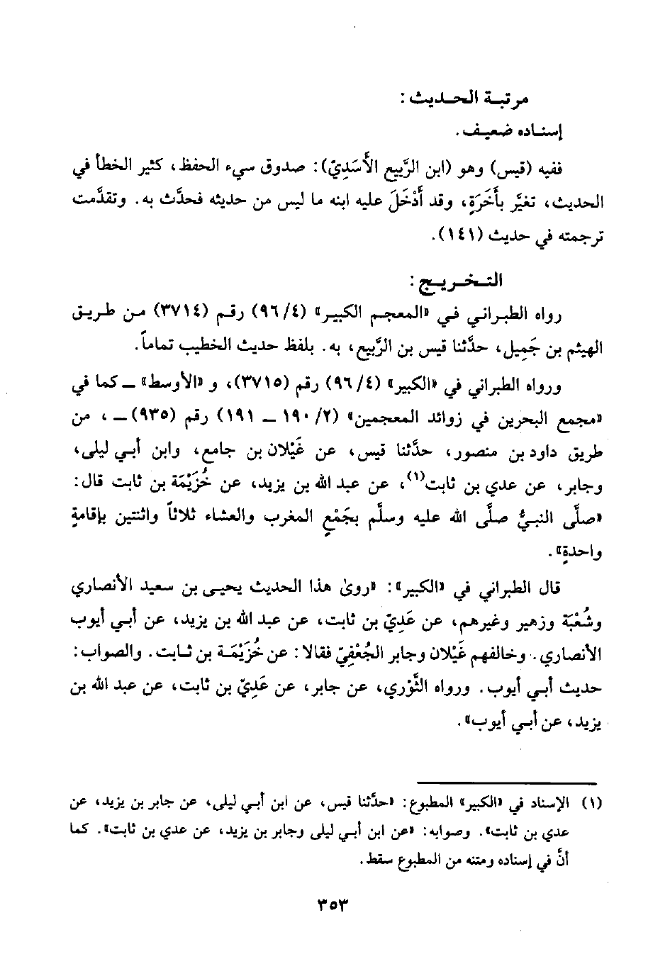 (¬١) الإِسناد في "الكبير" المطبوع: "حدَّثنا قيس، عن ابن أبي ليلى، عن جابر بن يزيد، عن عدي بن ثابت". وصوابه: "عن ابن أبي ليلى وجابر بن يزيد، عن عدي بن ثابت". كما أنَّ في إسناده ومتنه من المطبوع سقط.