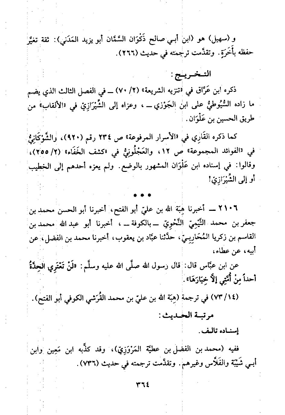 ٢١٠٦ - أخبرنا هِبَة اللَّه بن عليّ أبو الفتح، أخبرنا أبو الحسن محمد بن جعفر بن محمد التَّيْمِيّ النَّحْوِيّ -بالكوفة-، أخبرنا أبو عبد اللَّه محمد بن القاسم بن زكريا المُحَارِبِيّ، حدَّثنا عبَّاد بن يعقوب، أخبرنا محمد بن الفضل، عن أبيه، عن عطاء،