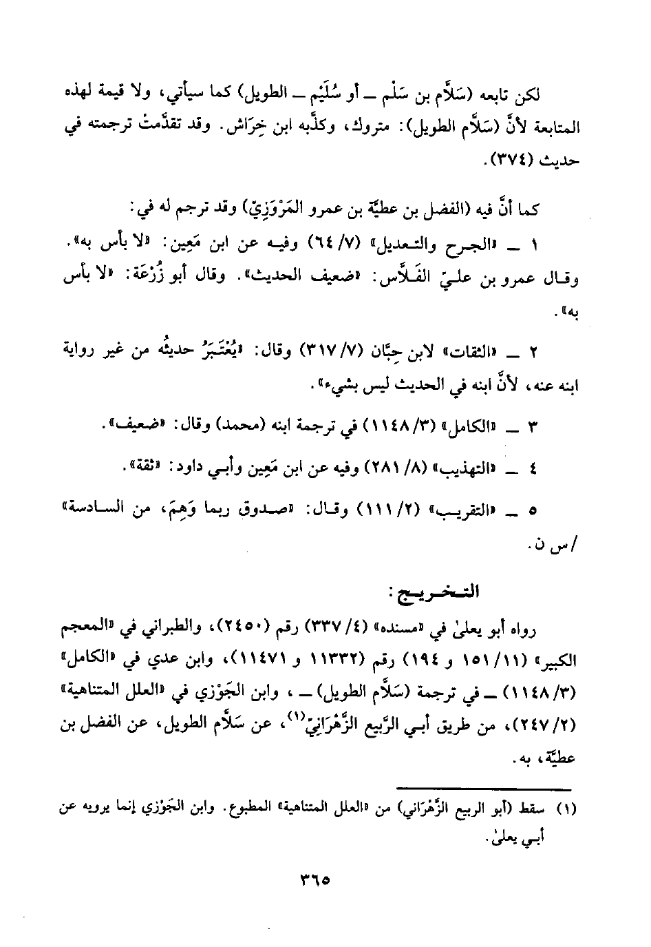 رواه أبو يعلى في "مسنده" (٤/ ٣٣٧) رقم (٢٤٥٠)، والطبراني في "المعجم الكبير" (١١/ ١٥١ و ١٩٤) رقم (١١٣٣٢ و ١١٤٧١)، وابن عدي في "الكامل" (٣/ ١١٤٨) -في ترجمة (سَلَّام الطويل) -، وابن الجَوْزي في "العلل المتناهية" (٢/ ٢٤٧)، من طريق أبي الرَّبيع الزَّهْرَانِيّ (¬١)، عن سَلَّام الطويل، عن الفضل بن عطيَّة، به.
