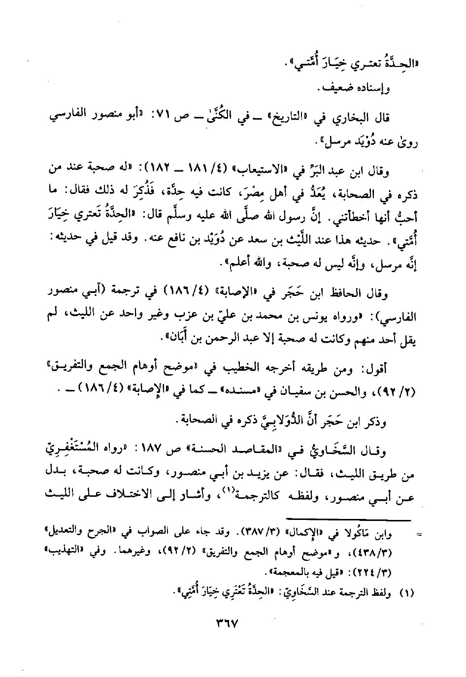 وقال الحافظ ابن حَجَر في "الإصابة" (٤/ ١٨٦) في ترجمة (أبي منصور الفارسي): "ورواه يونس بن محمد بن عليّ بن عزب وغير واحد عن الليث، لم يقل أحد منهم وكانت له صحبة إلا عبد الرحمن بن أَبَان".