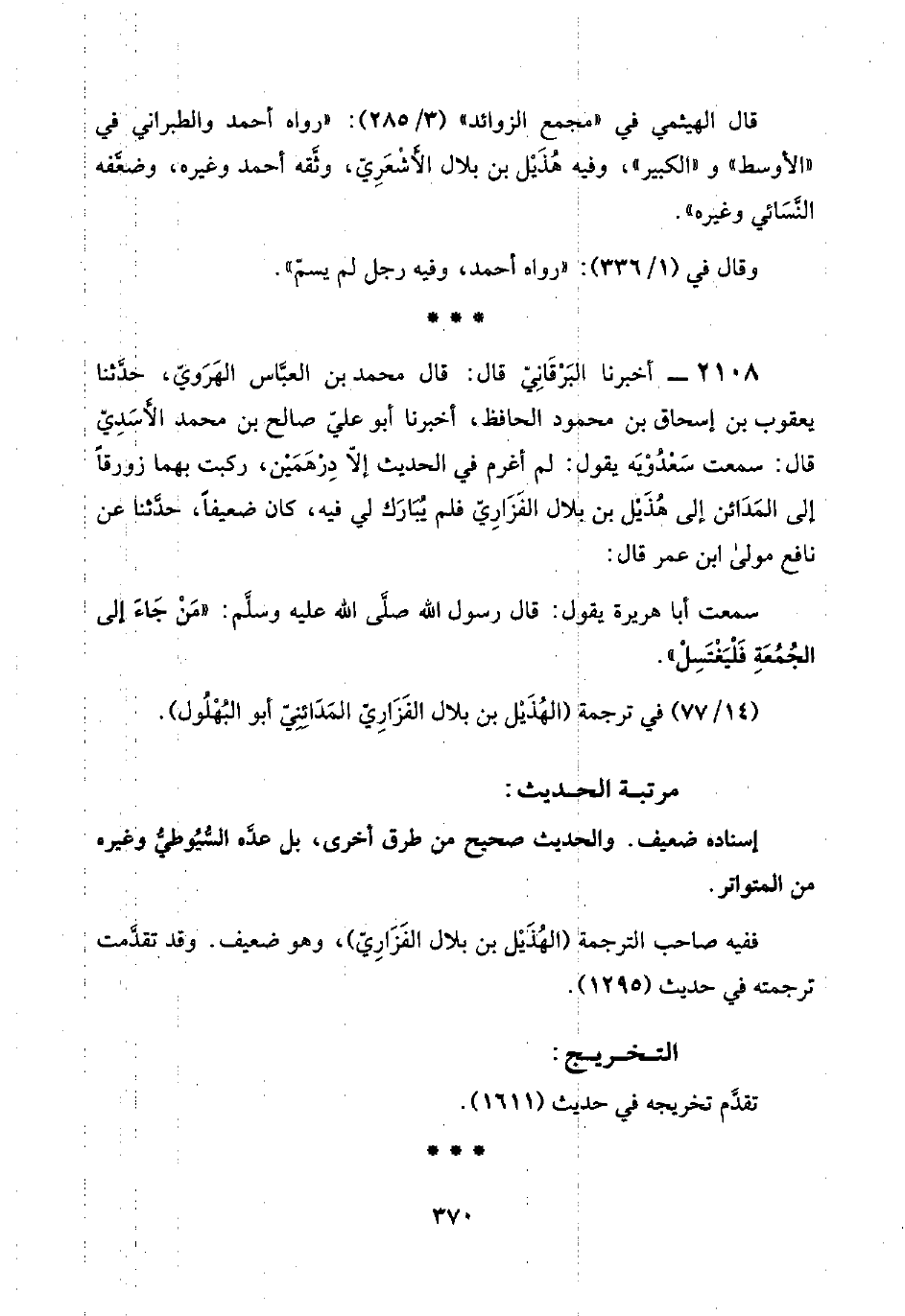 ففيه صاحب الترجمة (الهُذَيْل بن بلال الفَزَارِيّ)، وهو ضعيف. وقد تقدَّمت ترجمته في حديث (١٢٩٥).