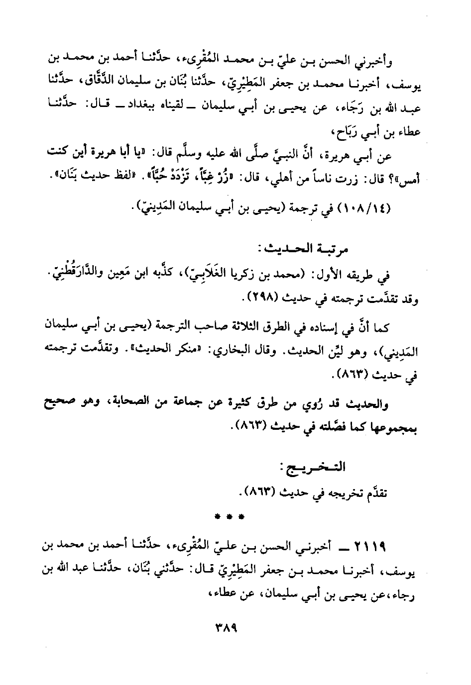 ٢١١٩ - أخبرني الحسن بن عليّ المُقْرِئ، حدَّثنا أحمد بن محمد بن يوسف، أخبرنا محمد بن جعفر المَطِيْرِيّ قال: حدَّثني بُنَان، حدَّثنا عبد اللَّه بن رجاء، عن يحيى بن أبي سليمان، عن عطاء،