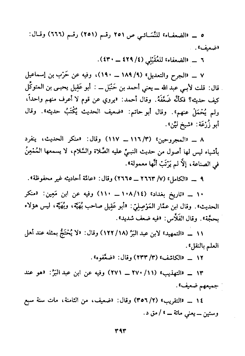 ١٠ - "تاريخ بغداد" (١٤/ ١٠٨ - ١١٠) وفيه عن ابن مَعِين: "منكر الحديث". وقال ابن عمَّار المُوْصِلِيّ: "أبو عَقِيل صاحب بُهَيَّة، وبُهَيَّة، ليس هؤلاء بحجَّة". وقال الفَلَّاس: "فيه ضعف شديد".