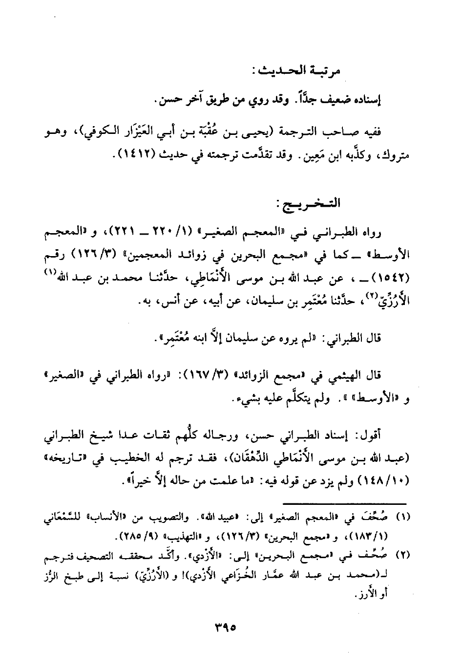 رواه الطبراني في "المعجم الصغير" (١/ ٢٢٠ - ٢٢١)، و"المعجم الأوسط" -كما في المجمع البحرين في "زوائد المعجمين" (٣/ ١٢٦) رقم (١٥٤٢) -، عن عبد اللَّه بن موسى الأَنْمَاطِي، حدَّثنا محمد بن عبد اللَّه (¬١) الأَرُزِّيّ (¬٢)، حدَّثنا مُعْتَمِر بن سليمان، عن أبيه، عن أنس، به.