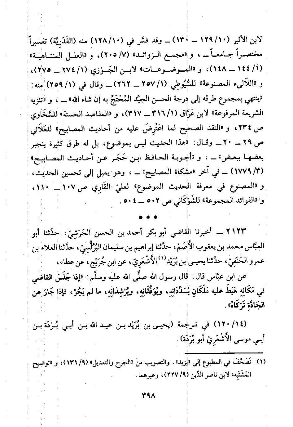 ٢١٢٣ - أخبرنا القاضي أبو بكر أحمد بن الحسن الحَرَشِيّ، حدَّثنا أبو العبَّاس محمد بن يعقوب الأَصَمّ، حدَّثنا إبراهيم بن سليمان البُرُلُّسِيّ، حدَّثنا العلاء بن عمرو الحَنَفِيّ، حدَّثنا يحيى بن بُرَيْد (¬١) الأَشْعَرِيّ، عن ابن جُرَيْج، عن عطاء،