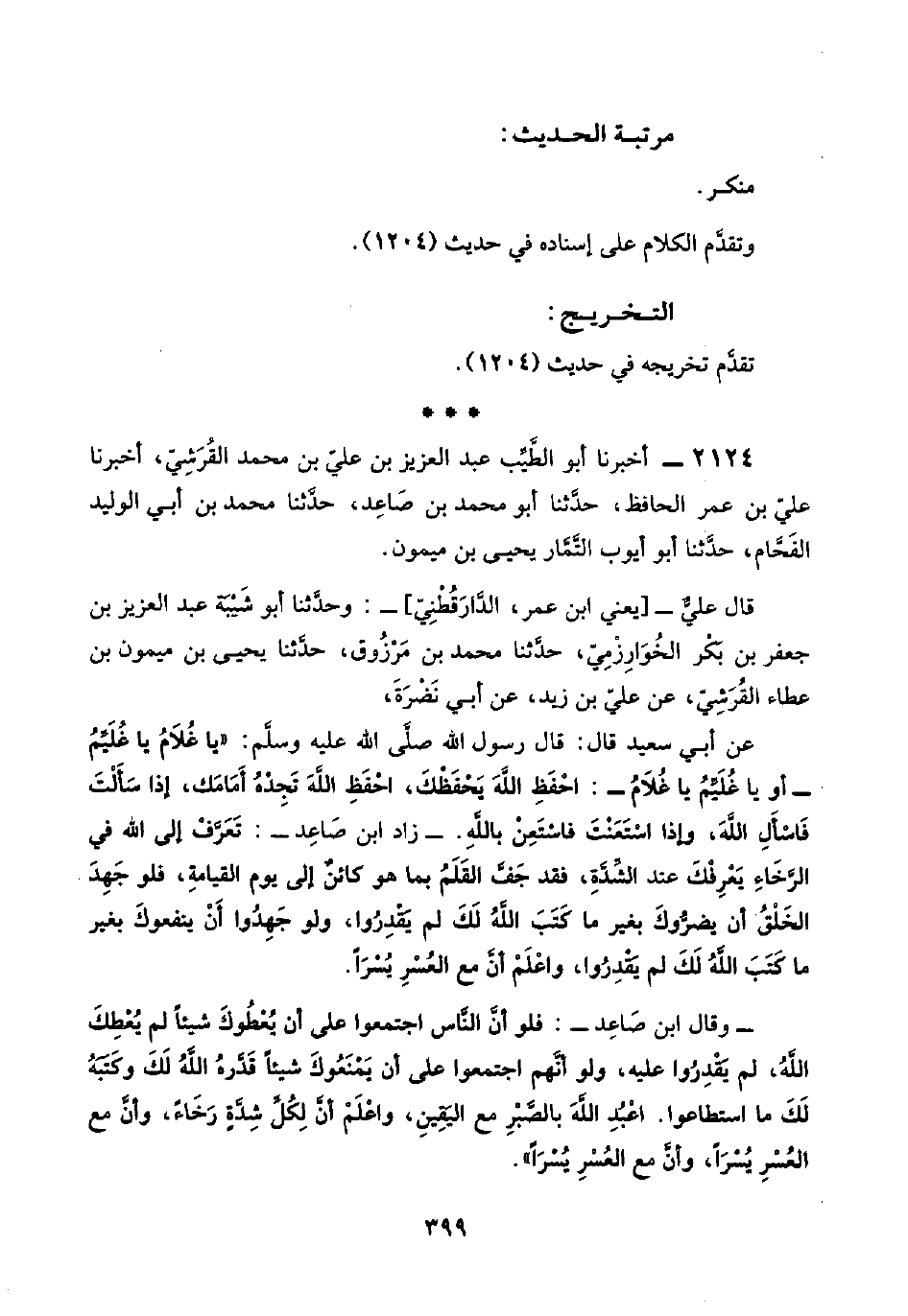 عن أبي سعيد قال: قال رسول اللَّه صلَّى اللَّه عليه وسلَّم: "يا غُلَامُ يا غُلَيِّمُ -أو يا غُلَيِّمُ يا غُلَامُ-: احْفَظِ اللَّهَ يَحْفَظْكَ، احْفَظِ اللَّهَ تَجِدْهُ أَمَامَك، إذا سَأَلْتَ فَاسْأَلِ اللَّهَ، وإذا اسْتَعَنْتَ فاسْتَعِنْ باللَّهِ. -زاد ابن صَاعِد-: تَعَرَّفْ إلى اللَّه في الرَّخَاءِ يَعْرِفْكَ عِنْد الشِّدَّةِ، فقد جَفَّ القَلَمُ بما هو كائنٌ إلى يوم القيامةِ، فلو جَهِدَ الخَلْقُ أن يَضُرُّوك بغير ما كَتَبَ اللَّهُ لَكَ لم يَقْدِرُوا، ولو جَهِدُوا أَنْ ينفعوكَ بغير ما كَتَبَ اللَّهُ لَكَ لم يَقْدِرُوا، واعْلَمْ أنَّ مع العُسْرِ يُسْرًا.