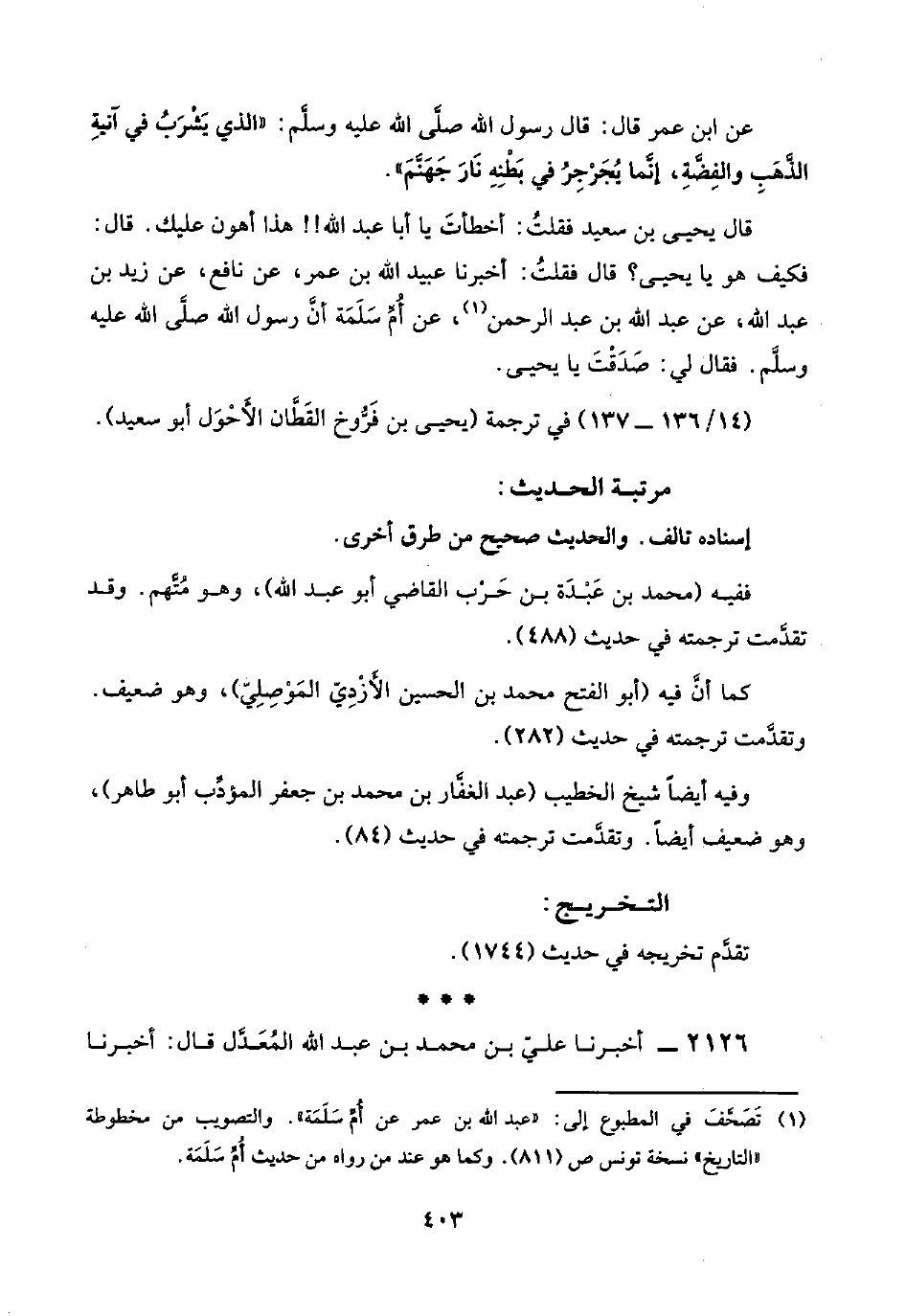 (¬١) تَصَحَّفَ في المطبوع إلى: "عبد اللَّه بن عمر عن أُمِّ سَلَمَة". والتصويب من مخطوطة "التاريخ" نسخة تونس ص (٨١١). وكما هو عند من رواه من حديث أُمِّ سَلَمَة.
