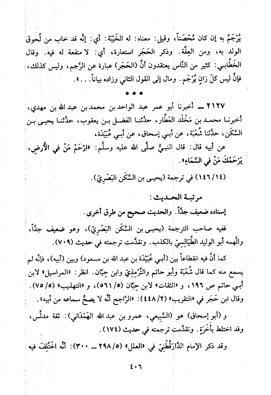 ٢١٢٧ - أخبرنا أبو عمر عبد الواحد بن محمد بن عبد اللَّه بن مهدي، أخبرنا محمد بن مَخْلَد العَطَّار، حدَّثنا الفضل بن يعقوب، حدَّثنا يحيى بن السَّكَن، حدَّثنا شُعْبَة، عن أبي إسحاق، عن أبي عُبَيْدَة،