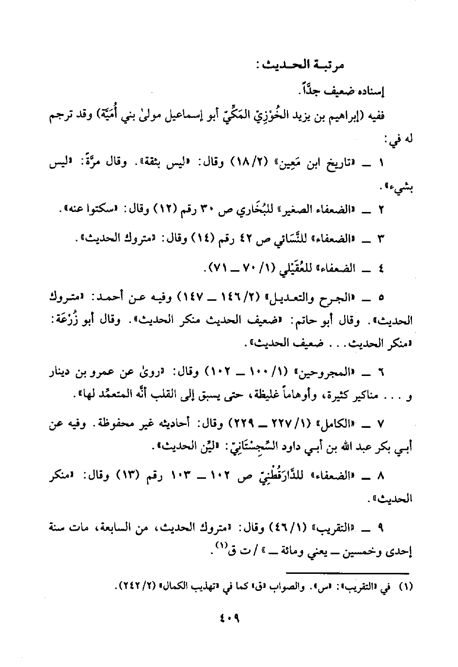ففيه (إبراهيم بن يزيد الخُوْزِيّ المَكِّيّ أبو إسماعيل مولى بني أُمَيَّة) وقد ترجم له في: