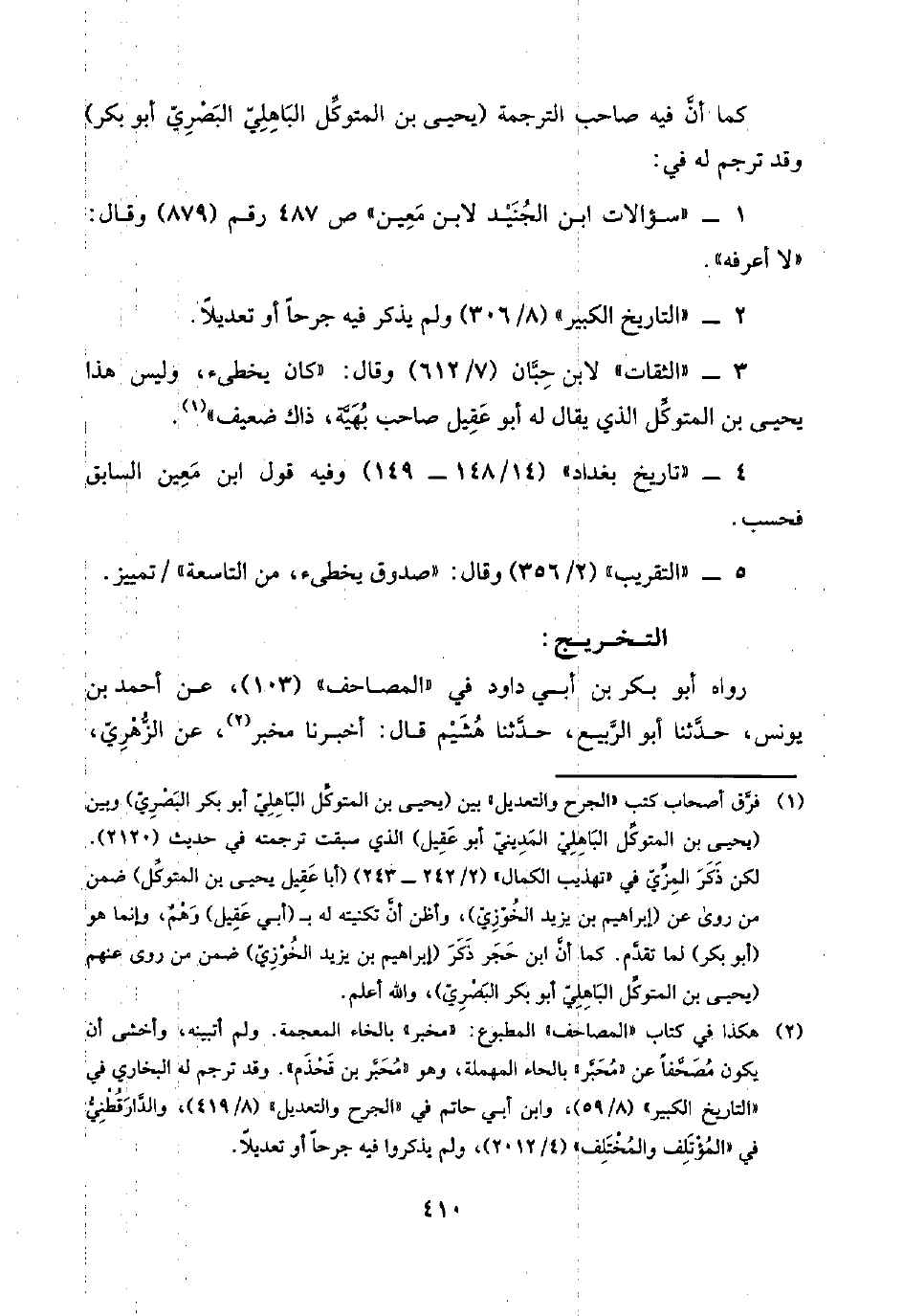 (¬١) فرَّق أصحاب كتب "الجرح والتعديل" بين (يحيى بن المتوكِّل البَاهِلِيّ أبو بكر البَصْريّ) وبين يحيى بن المتوكِّل البَاهِلِي المَدِينيّ أبو عَقِيل) الذي سبقت ترجمته في حديث (٢١٢٠). لكن ذَكَرَ المِزِّيّ في "تهذيب الكمال" (٢/ ٢٤٢ - ٢٤٣) (أبا عَقِيل يحيى بن المتوكِّل) ضمن من روى عن (إبراهيم بن يزيد الخُوْزِيّ)، وأظن أنَّ تكنيته له بـ (أبي عَقِيل) وَهِمٌ، وإنما هو أبو بكر) لمَّا تقدَّم. كما أنَّ ابن حَجَر ذَكَرَ (إبراهيم بن يزيد الخُوْزِيّ) ضمن من روى عنهم (يحيى بن المتوكِّل البَاهِلِيّ أبو بكر البَصْرِيّ)، واللَّه أعلم.