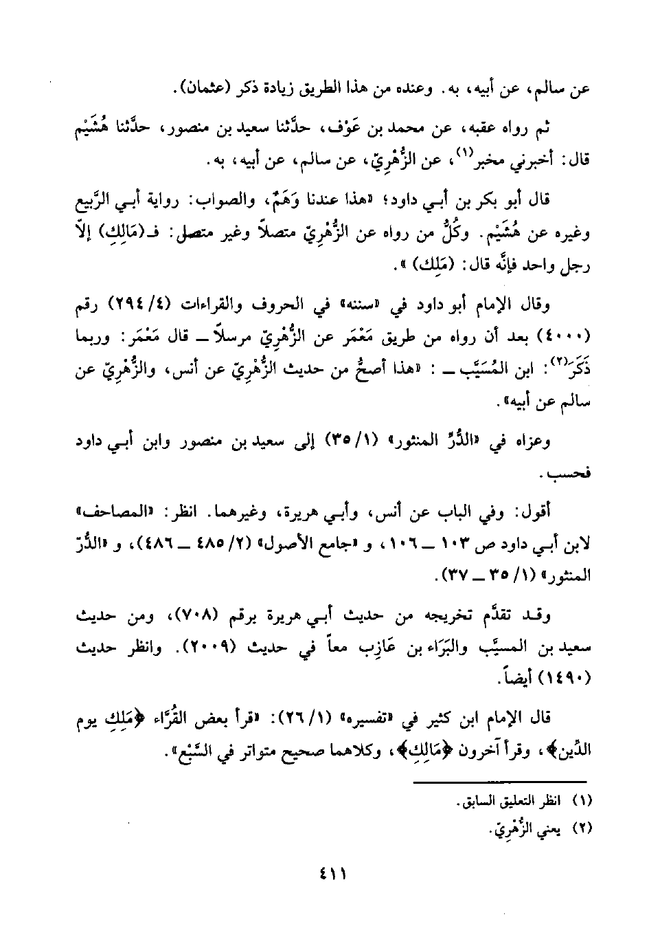 قال أبو بكر بن أبي داود؛ "هذا عندنا وَهَمٌ، والصواب: رواية أبي الرَّبيع وغيره عن هُشَيْم. وكُلُّ من رواه عن الزُّهْرِيّ متصلًا وغير متصل: فـ (مَالِكِ) إلّا رجل واحد فإنَّه قال: (مَلِك) ".