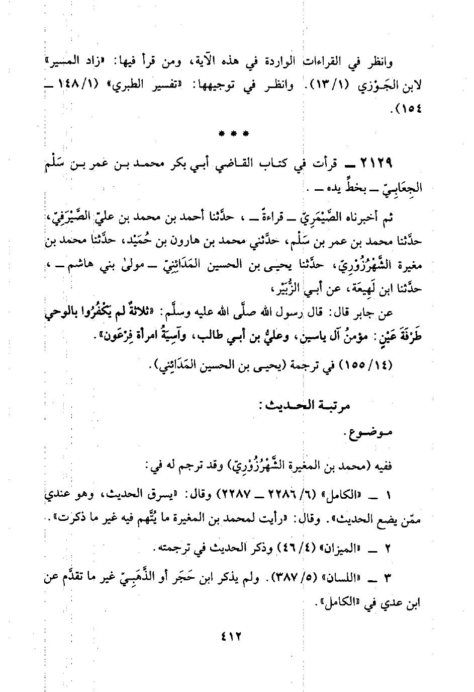 ٢١٢٩ - قرأت في كتاب القاضي أبي بكر محمد بن عمر بن سَلْم الجِعَابِيّ -بخطِّ يده-.