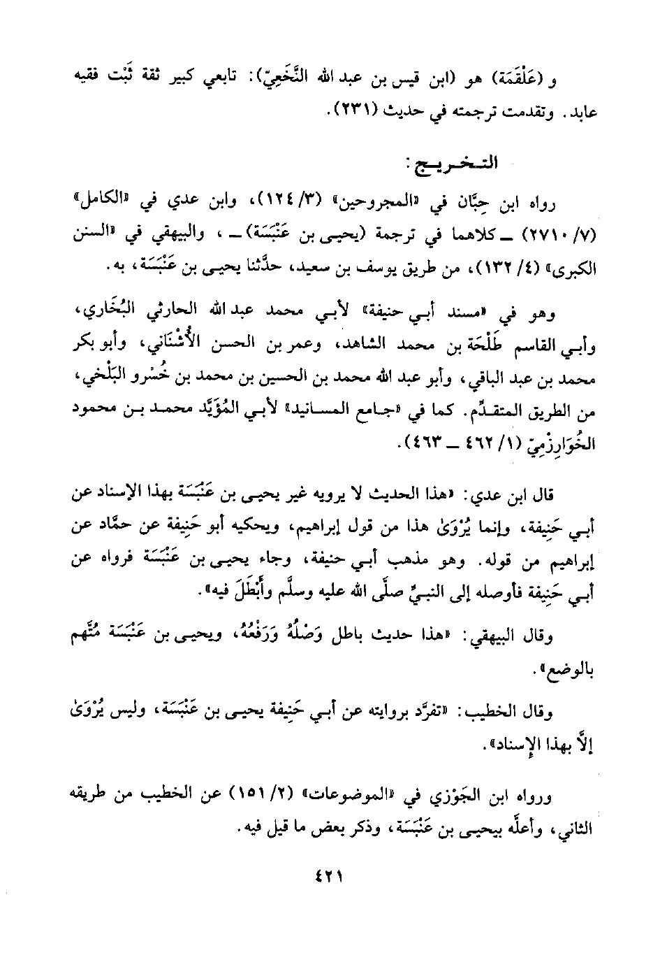 قال ابن عدي: "هذا الحديث لا يرويه غير يحيى بن عَنْبَسَة بهذا الإسناد عن أبي حَنِيفة، وإنما يُرْوَى هذا من قول إبراهيم، ويحكيه أبو حَنِيفة عن حمَّاد عن إبراهيم من قوله. وهو مذهب أبي حنيفة، وجاء يحيى بن عَنْبَسَة فرواه عن أبي حَنِيفة فأوصله إلى النبيِّ صلَّى اللَّه عليه وسلَّم وأَبْطَلَ فيه".