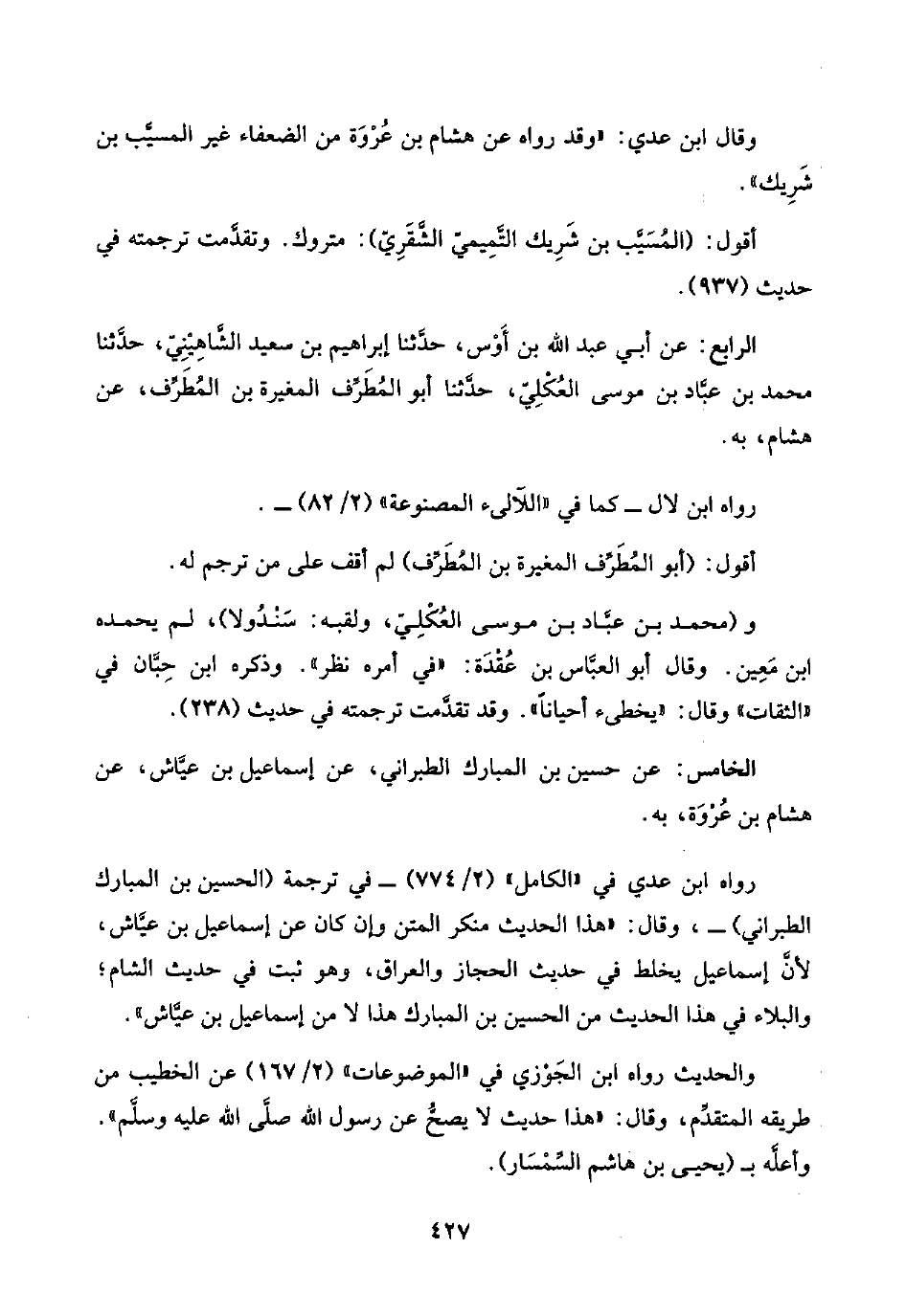 وقال ابن عدي: "وقد رواه عن هشام بن عُرْوَة من الضعفاء غير المسيَّب بن شَرِيك".