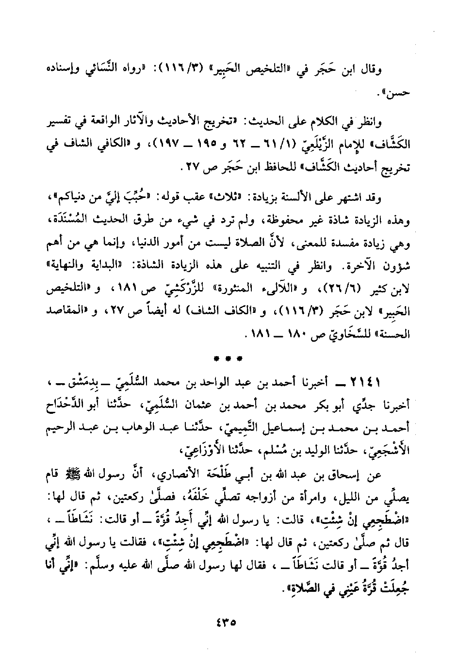 وقد اشتهر على الألسنة بزيادة: "ثلاث" عقب قوله: "حُبِّبَ إليَّ من دنياكم"، وهذه الزيادة شاذة غير محفوظة، ولم ترد في شيء من طرق الحديث المُسْنَدَة، وهي زيادة مفسدة للمعنى، لأنَّ الصلاة ليست من أمور الدنيا، وإنما هي من أهم شؤون الآخرة. وانظر في التنبيه على هذه الزيادة الشاذة: "البداية والنهاية" لابن كثير (٦/ ٢٦)، و"اللآلئ المنثورة" للزَّرْكَشِيّ ص ١٨١، و"التلخيص الحَبِير" لابن حَجَر (٣/ ١١٦)، و"الكاف الشاف" له أيضًا ص ٢٧، و"المقاصد الحسنة" للسَّخَاويّ ص ١٨٠ - ١٨١.