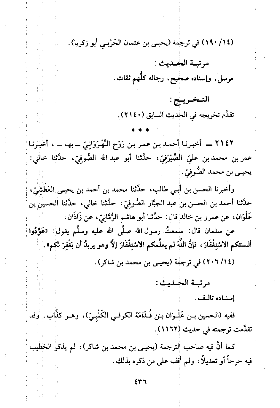 ٢١٤٢ - أخبرنا أحمد بن عمر بن رَوْح النَّهْرَوَانِيّ -بها-، أخبرنا عمر بن محمد بن عليّ الصَّيْرَفِيّ، حدَّثنا أبو عبد اللَّه الصُّوفِيّ، حدَّثنا خالي: يحيى بن محمد الصُّوفِيّ.