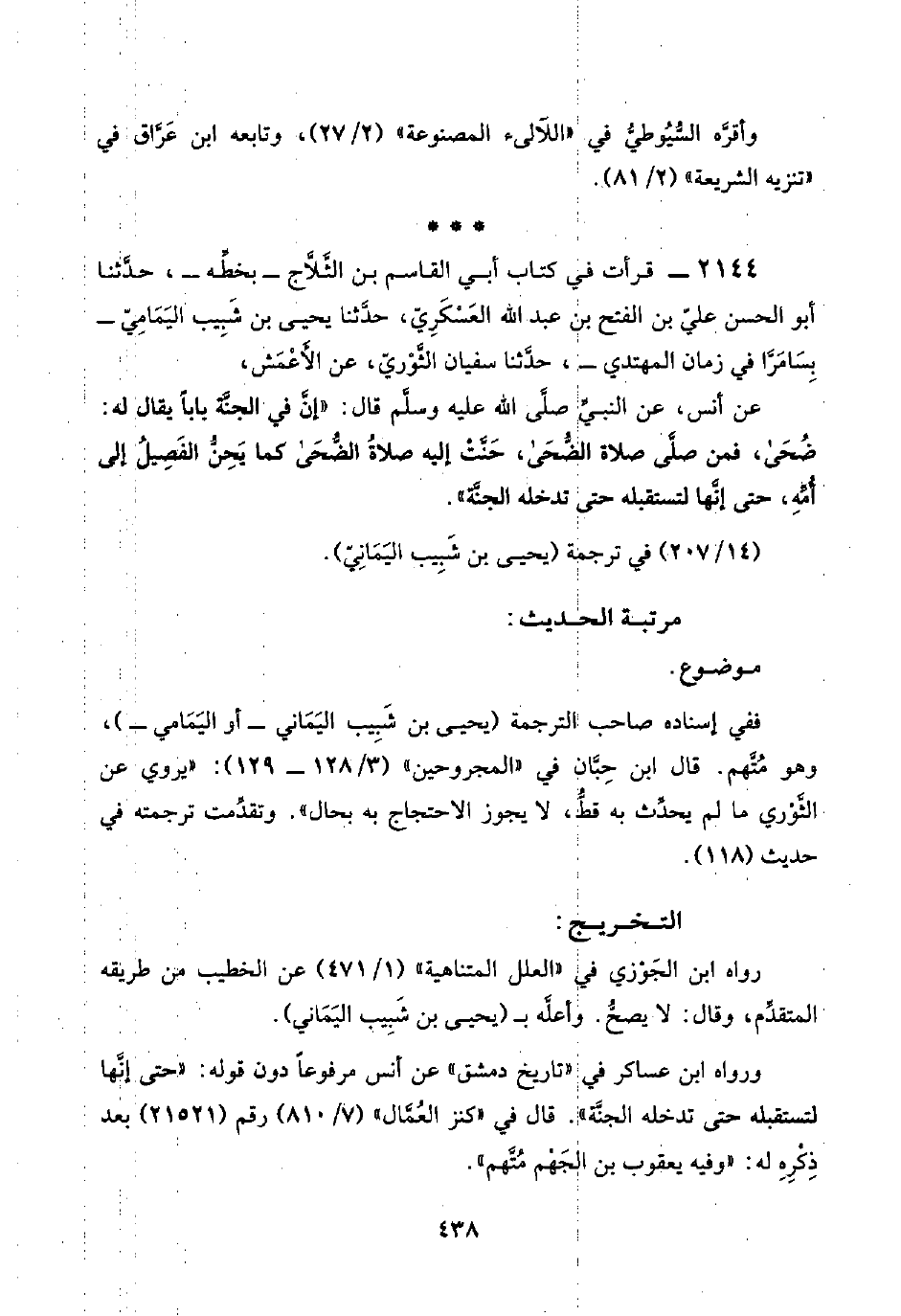 ٢١٤٤ - قرأت في كتاب أبي القاسم بن الثَّلَّاج -بخطِّه-، حدَّثنا أبو الحسن عليّ بن الفتح بن عبد اللَّه العَسْكَرِيّ، حدَّثنا يحيى بن شَبِيب اليَمَامِيّ -بِسَامَرَّا في زمان المهتدي-، حدَّثنا سفيان الثَّوْريّ، عن الأَعْمَش،