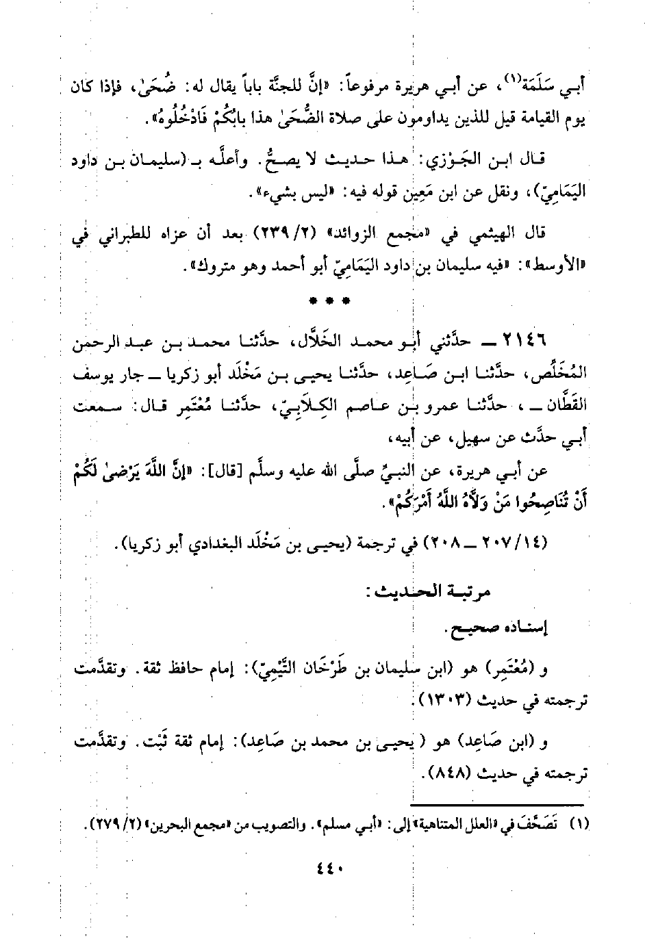 ٢١٤٦ - حدَّثني أبو محمد الخَلَّال، حدَّثنا محمد بن عبد الرحمن المُخَلِّص، حدَّثنا ابن صَاعِد، حدَّثنا يحيى بن مَخْلَد أبو زكريا -جار يوسف القَطَّان-، حدَّثنا عمرو بن عاصم الكِلَابِيّ، حدَّثنا مُعْتَمِر قال: سمعت أبي حدَّث عن سهيل، عن أبيه،