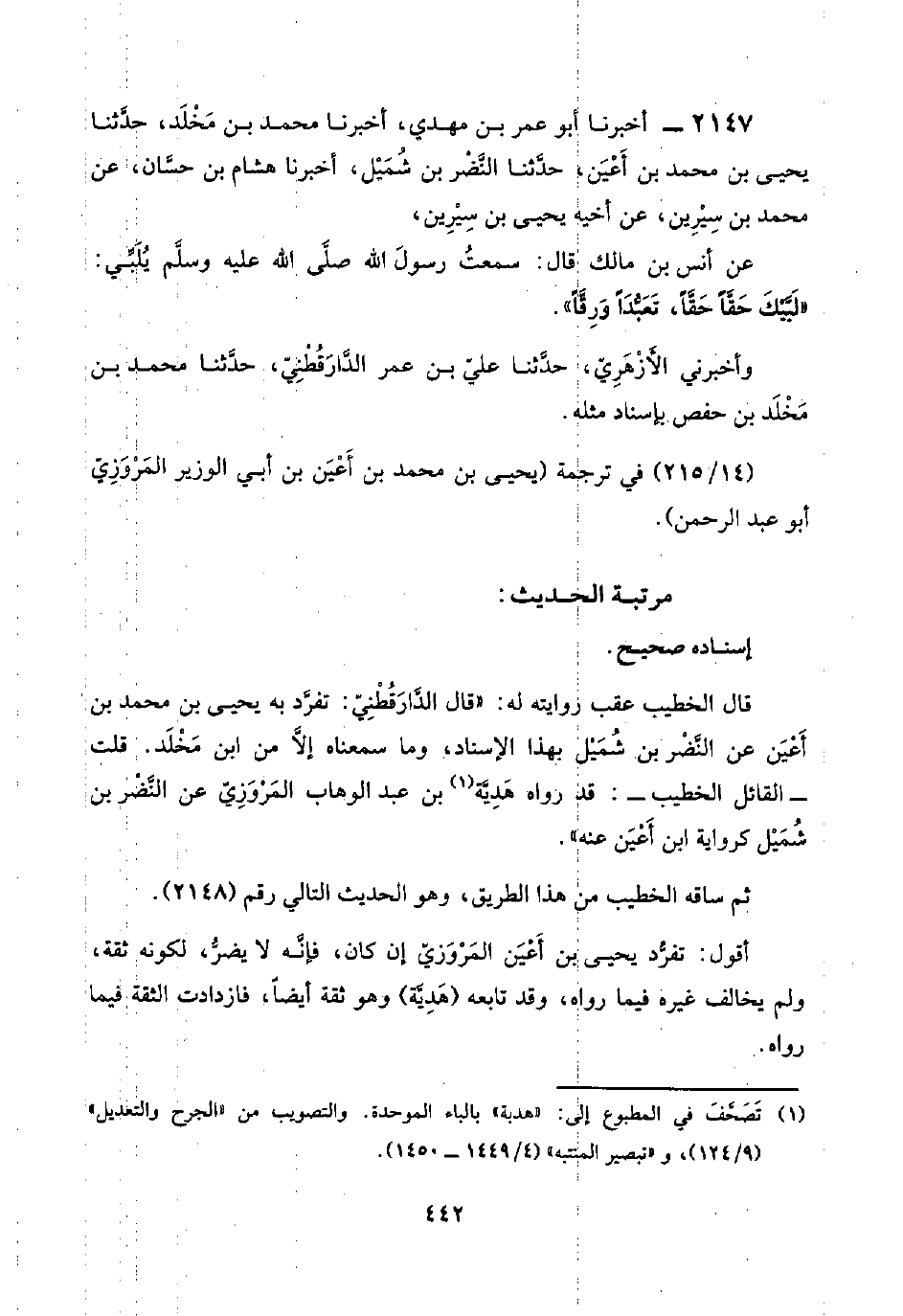 ٢١٤٧ - أخبرنا أبو عمر بن مهدي، أخبرنا محمد بن مَخْلَد، حدَّثنا يحيى بن محمد بن أَعْيَن، حدَّثنا النَّضْر بن شُمَيْل، أخبرنا هشام بن حسَّان، عن محمد بن سِيْرِين، عن أخيه يحيى بن سِيْرِين،